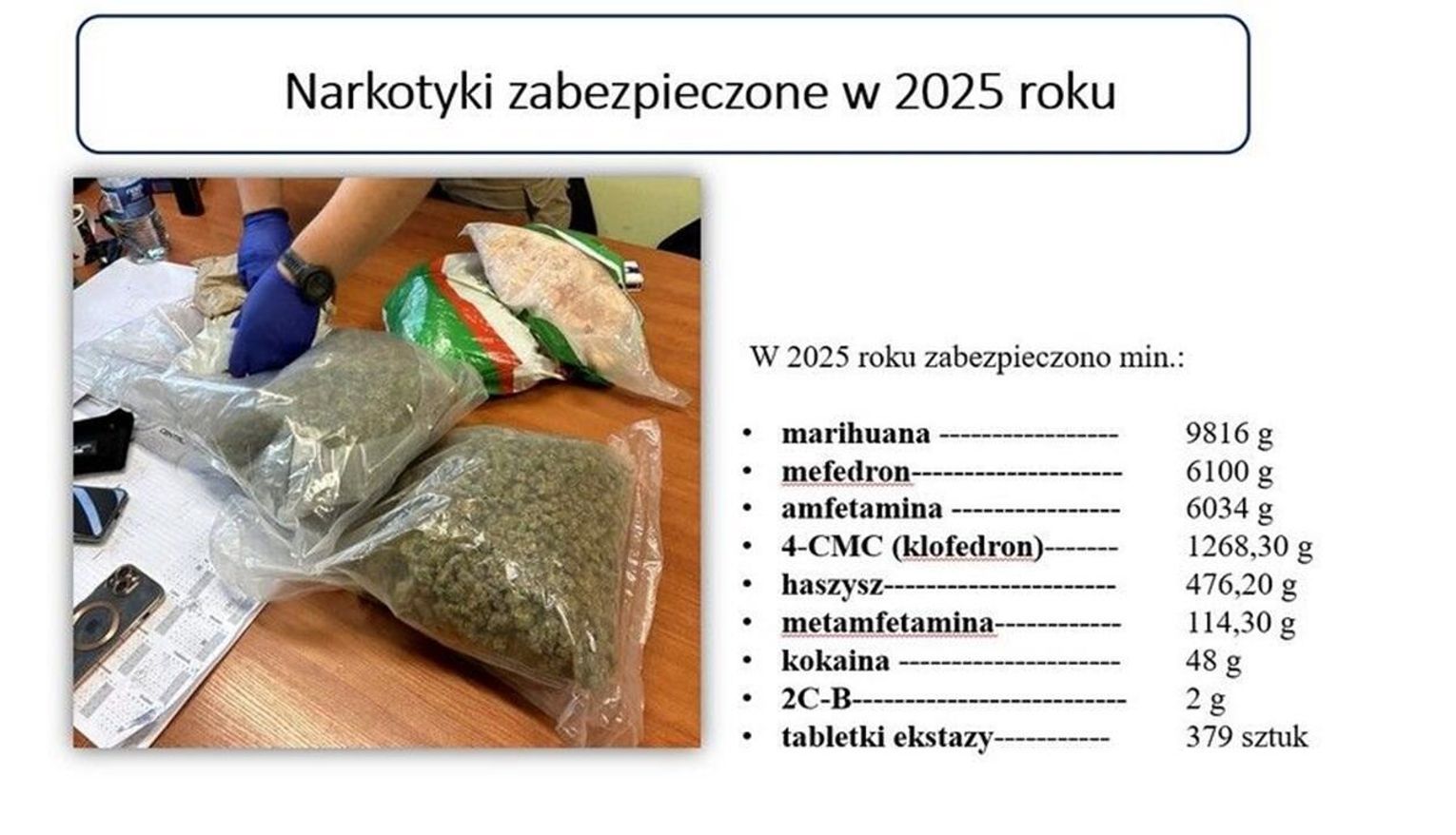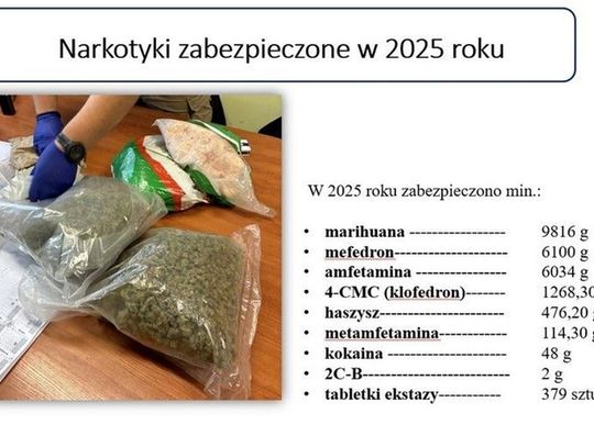 Druga część spotkania poświęcona była odprawie rocznej, podczas której mł. insp. Remigiusz Wierzba przedstawił szczegółowe wyniki pracy jednostki za 2025 rok. Z przedstawionych danych wynika, że był to czas wytężonej i skutecznej pracy, ponieważ ogólna wykrywalność przestępstw wzrosła do poziomu 80 procent. Policjanci odnotowali spadek liczby kradzieży i włamań w porównaniu do roku 2024, a w przypadku bójek i pobić udało się ustalić sprawców w każdym zgłoszonym zdarzeniu. Sukcesem zakończyły się również działania wymierzone w rynek narkotykowy, o czym świadczy zabezpieczenie blisko 24 kilogramów nielegalnych substancji, takich jak amfetamina, kokaina czy mefedron.