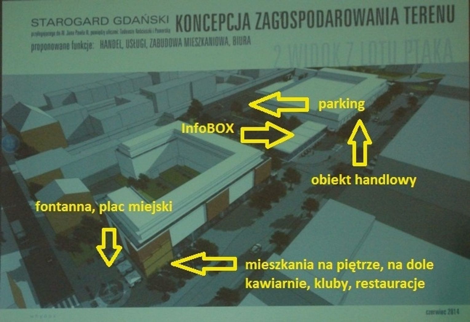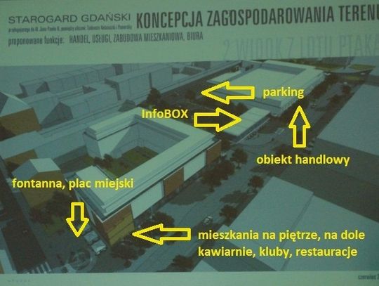 Wstępny plan zakłada teren, na którym znajdą się obiekty mieszkalne, usługowe, handlowe, infobox (czyli małe centrum informacji turystycznej) a nawet i niewielkie place miejskie z fontannami czy parasolami.