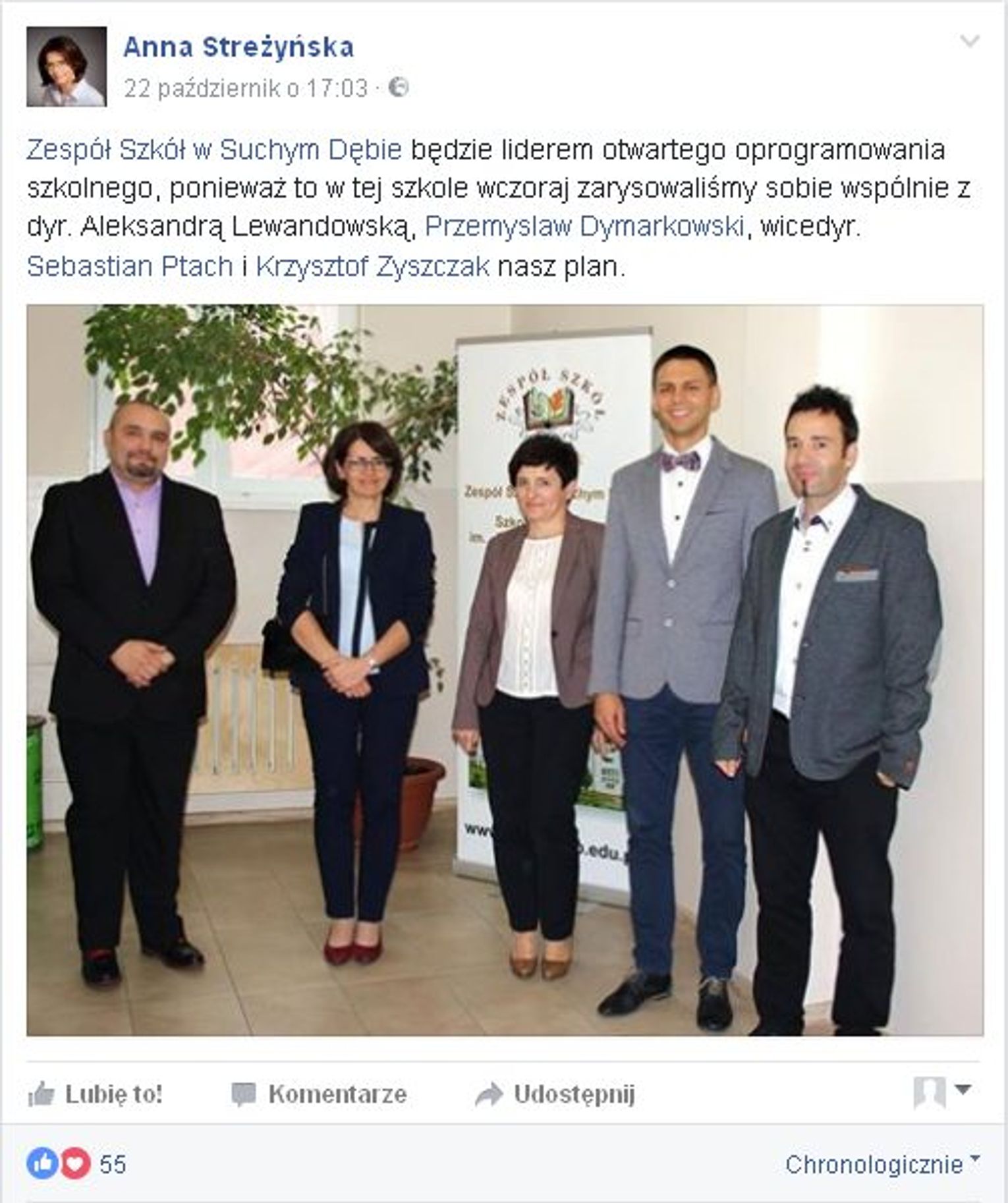 Wpis na profilu facebook Pani Minister po jej wizycie w ZS w Suchym Dębie:
