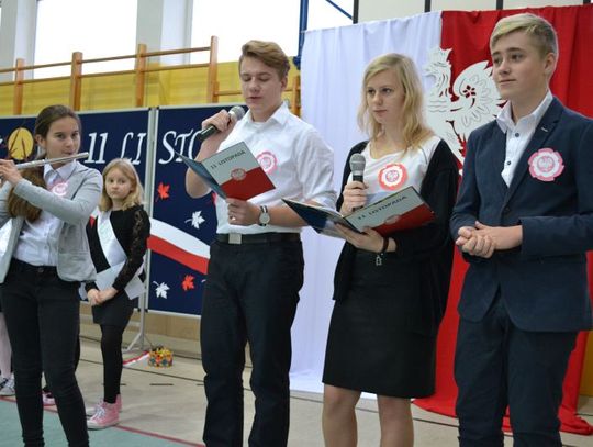 Uczniowie uczcili święto narodowe przywdziewając biało – czerwone kotyliony z godłem narodowym. Biały orzeł na czerwonym tle towarzyszył Polakom od początku istnienia naszego państwa.Wśród zaproszonych gości byli: