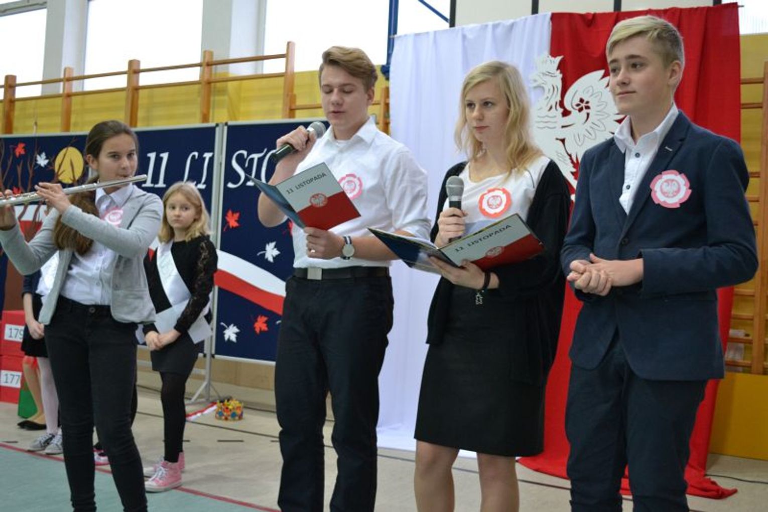 Uczniowie zaśpiewali i zagrali utwór „Deszcz jesienny”. Patriotyczną wiązankę piosenek wykonała cała społeczność szkolna: „Przybyli ułani”, „Wojenko, wojenko”, „Bo wszyscy Polacy to jedna rodzina”.