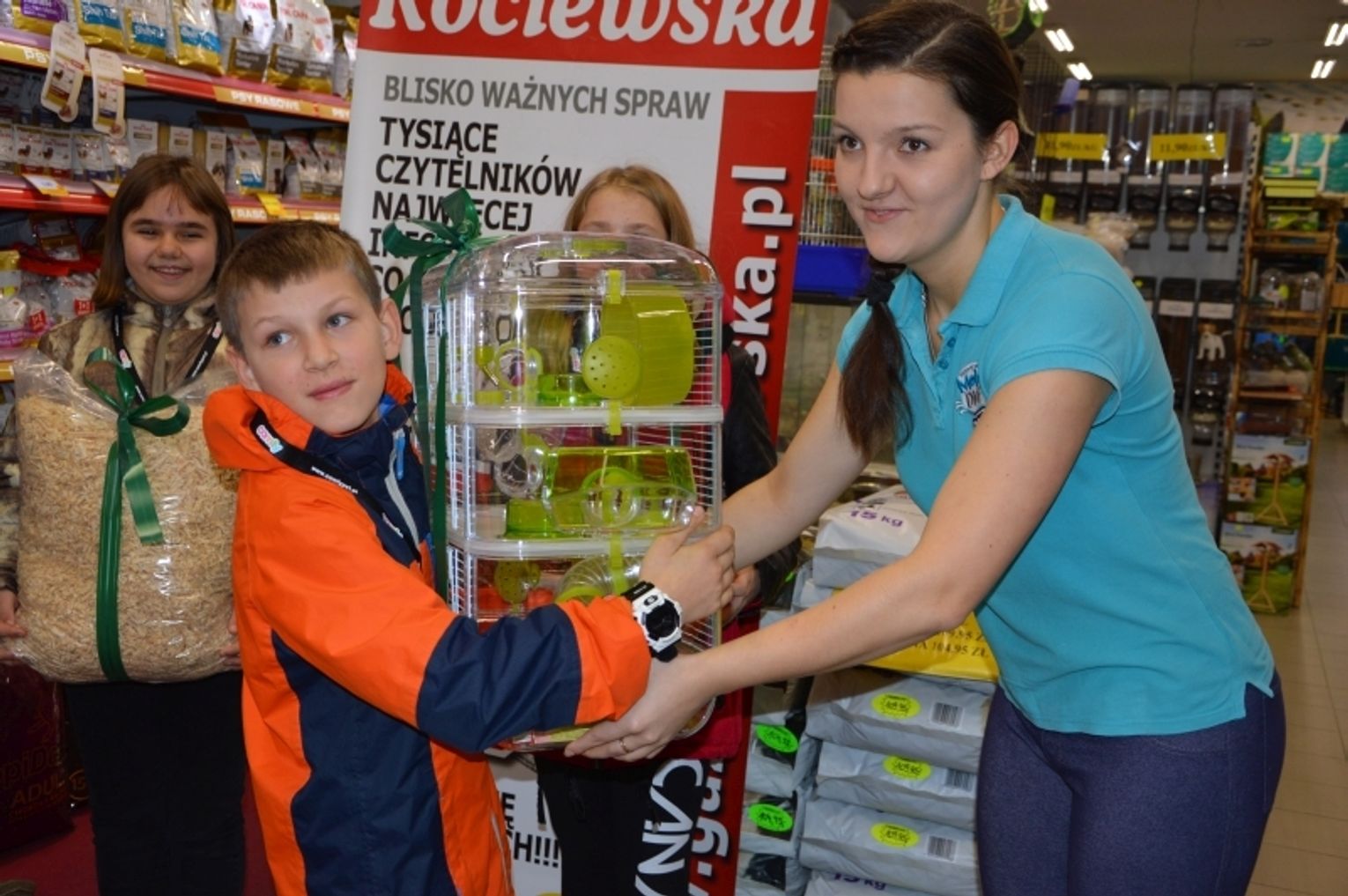 Nasz mały zwycięzca otrzymał świetną, 3-pietrową klatkę „Zolux”, zapas trocin, pokarmów i przysmaków. Każdy uczeń dostał też po pamiątkowej smyczy.