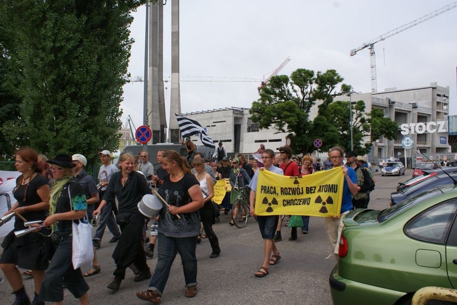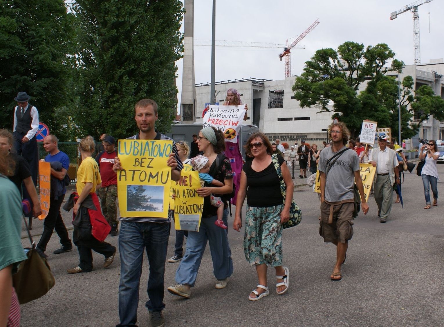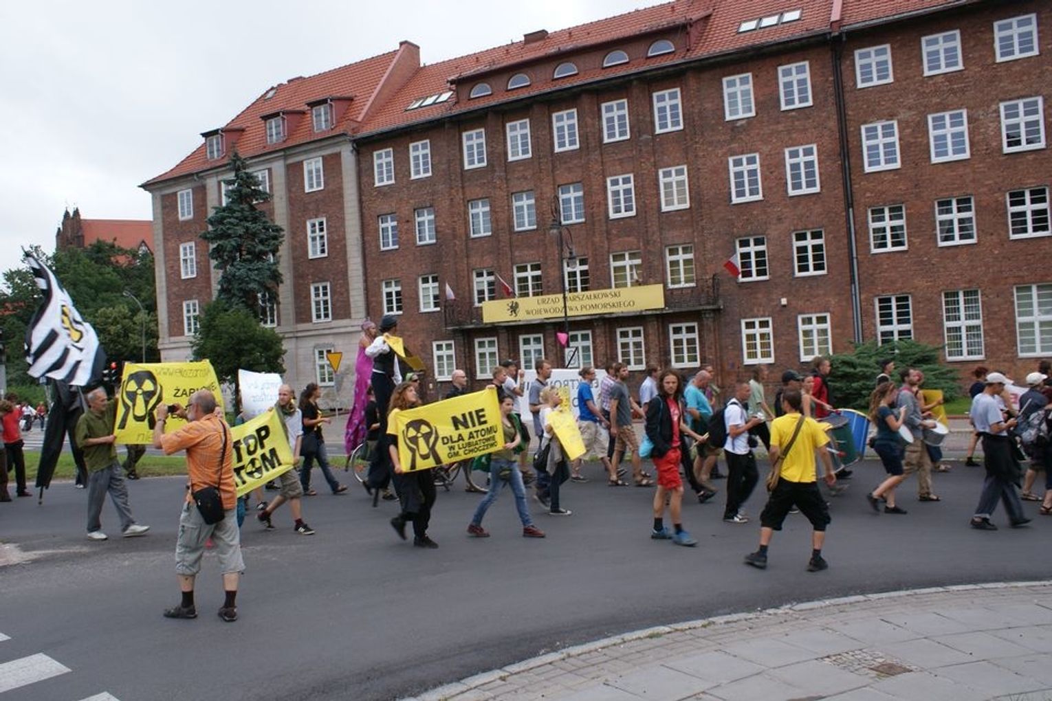 Tam pod Trzema Krzyżami przez godzinę trwał wiec. Następnie protestujący przeszli ulicami Gdańska pod Urząd Wojewódzki. W manifestacji udział wzięło ok. 200 osób. Uczestnicy demonstracji to głównie osoby, które miniony tydzień spędzili na Obozie Antyatomowym Lubiatowo 2012. Manifestowali także mieszkańcy gmin zagrożonych budową elektrowni jądrowych, działacze organizacji ekologicznych i ruchów społecznych, anarchiści, eksperci zajmujący się zagrożeniami jakie niesie ze sobą energetyka jądrowa i mieszkańcy Trójmiasta. Demonstrującym towarzyszyła grupa bębniarzy samby ulicznej oraz białoruski teatr Kryly Halopa, którego aktorzy przeszli trasę na szczudłach.