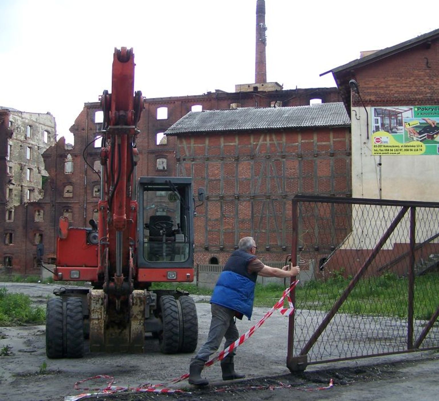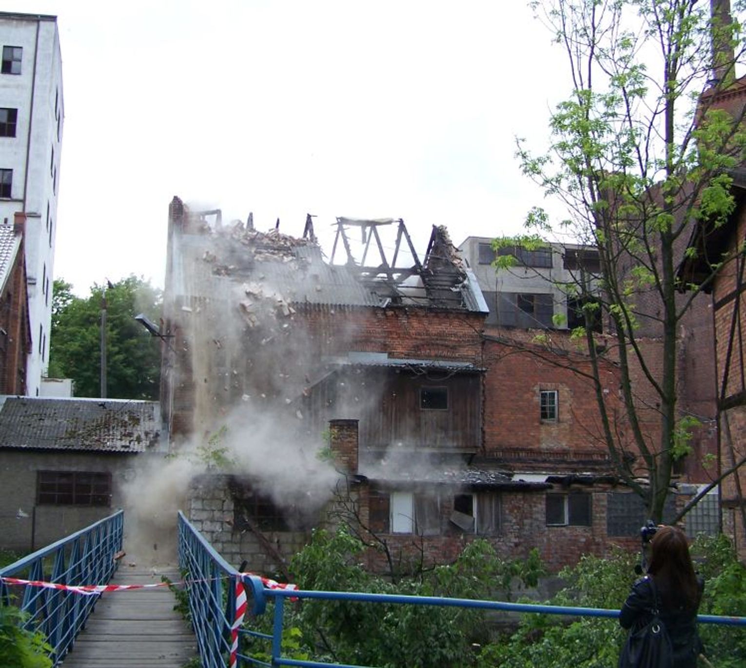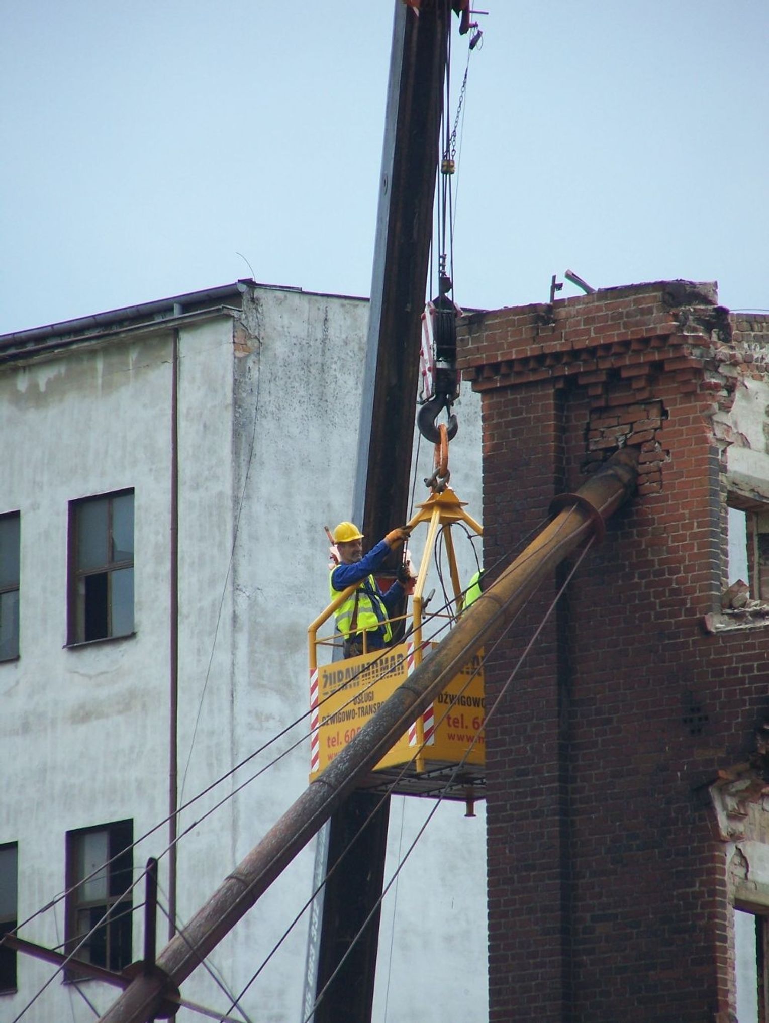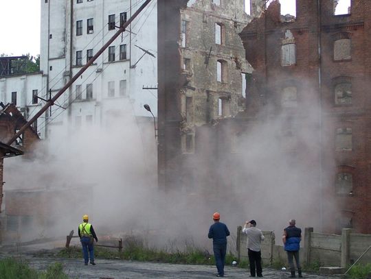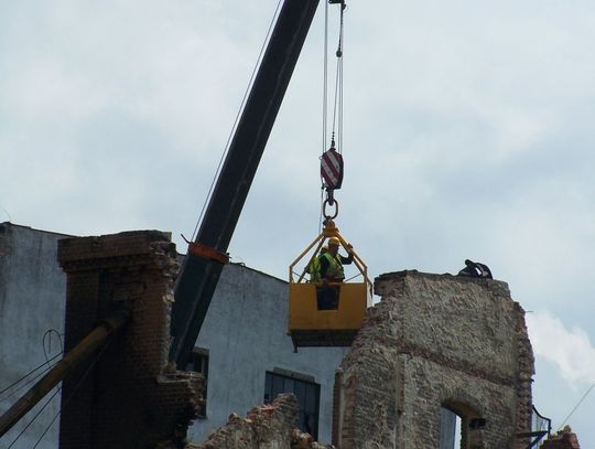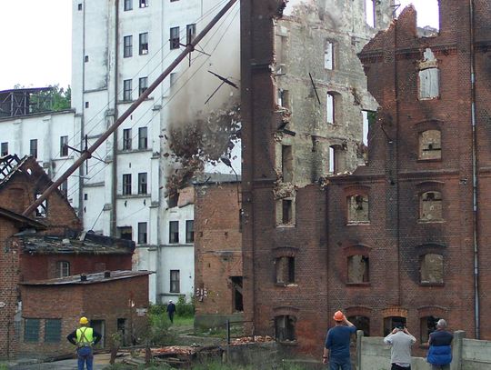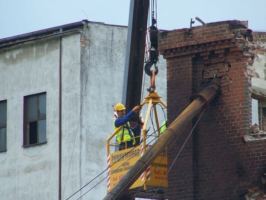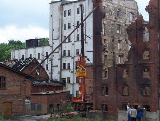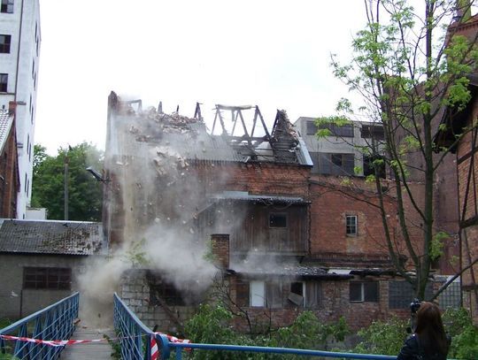 W środę 29 maja miała miejsce akcja wyburzania zagrażającej zawaleniem i najbardziej zniszczonej w trakcie niedzielnego pożaru ściany starogardzkich młynów. Przy okazji zburzono komin spalonego budynku mieszkalnego, który także groził zawaleniem. Prace wykonywała firma z Lęborka. (fot. Edyta Lichy)