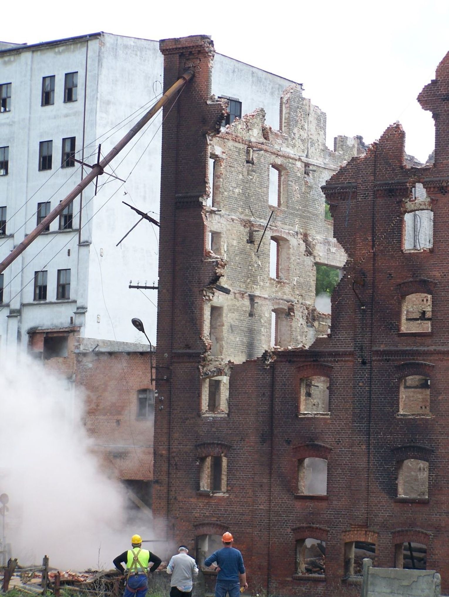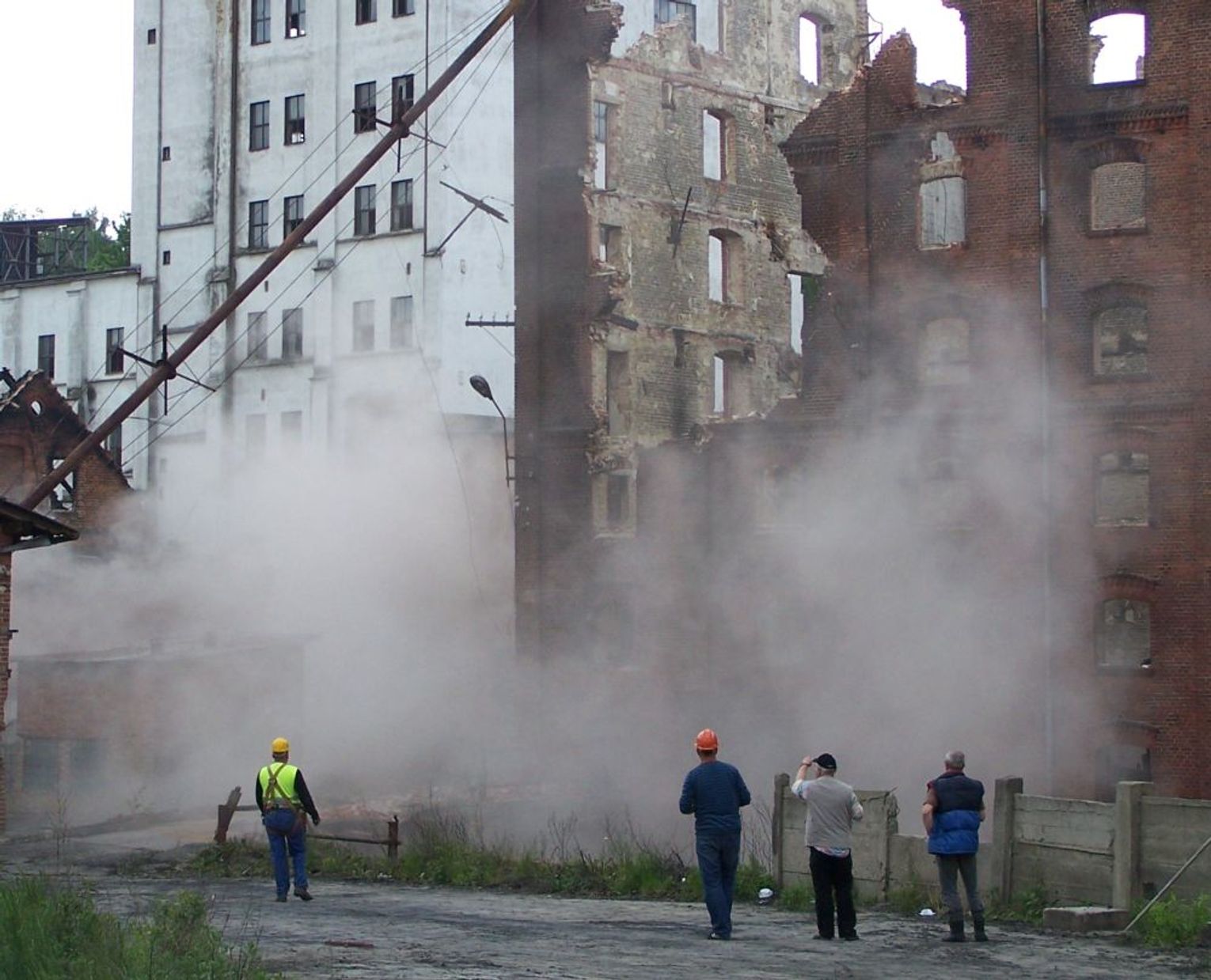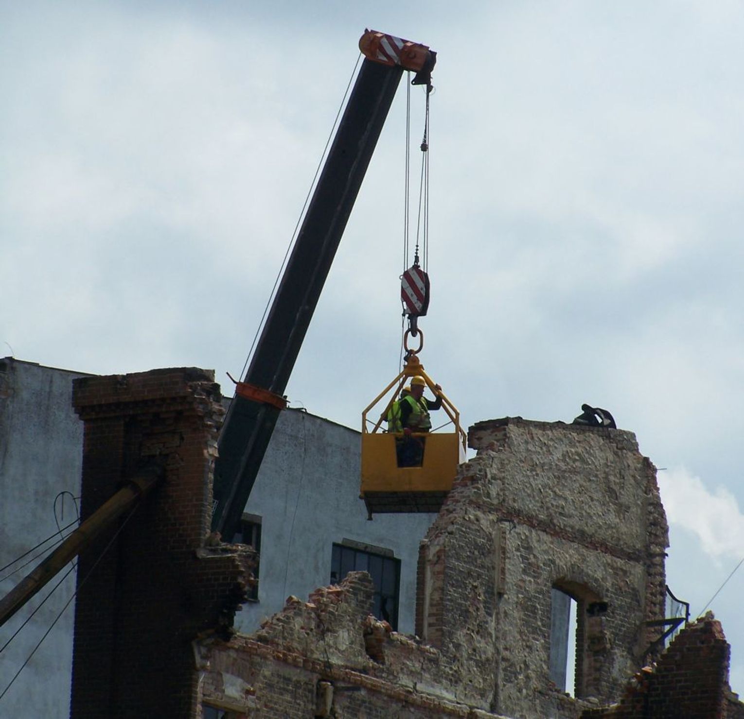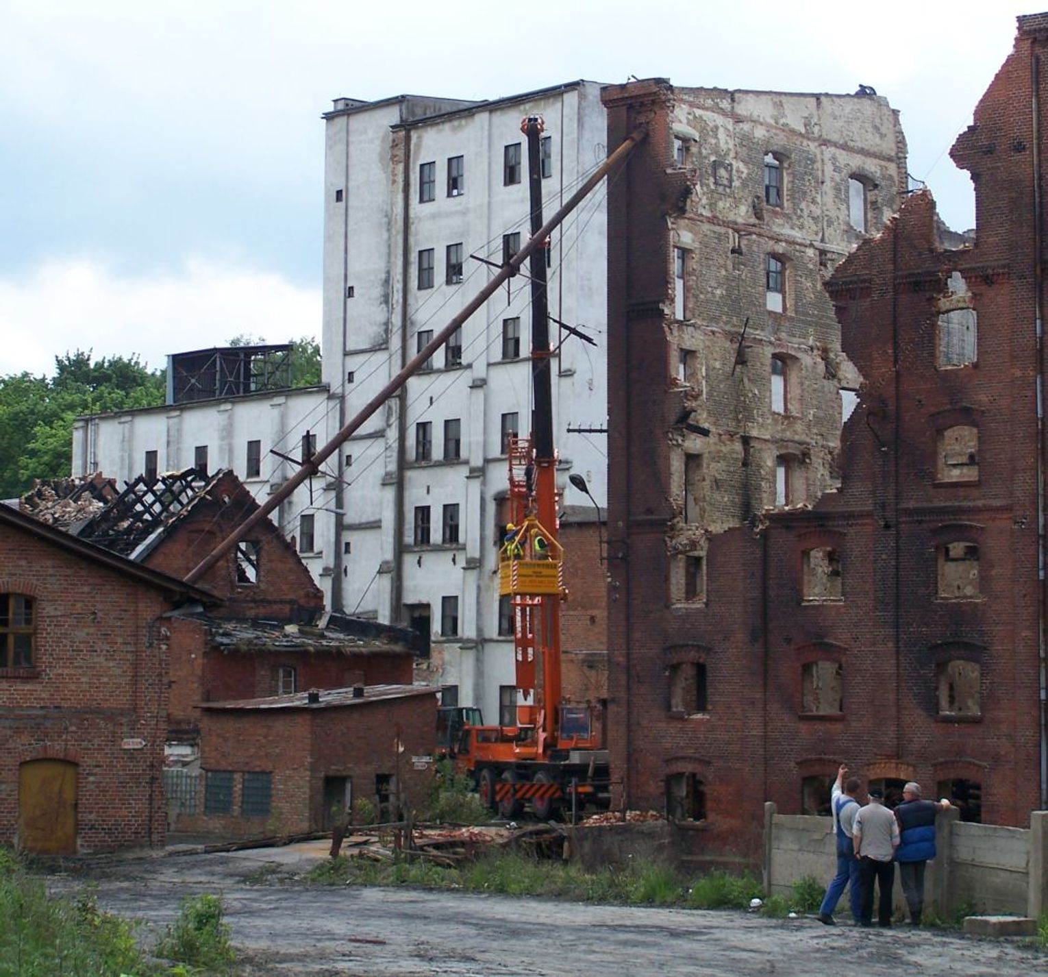 W środę 29 maja miała miejsce akcja wyburzania zagrażającej zawaleniem i najbardziej zniszczonej w trakcie niedzielnego pożaru ściany starogardzkich młynów. Przy okazji zburzono komin spalonego budynku mieszkalnego, który także groził zawaleniem. Prace wykonywała firma z Lęborka. (fot. Edyta Lichy)