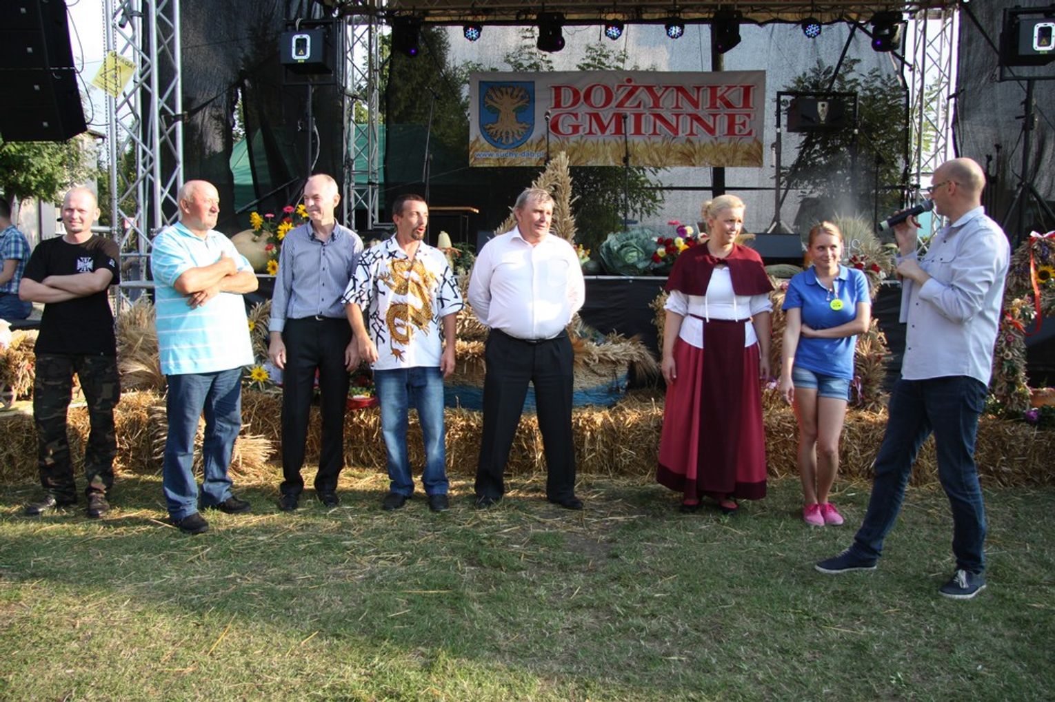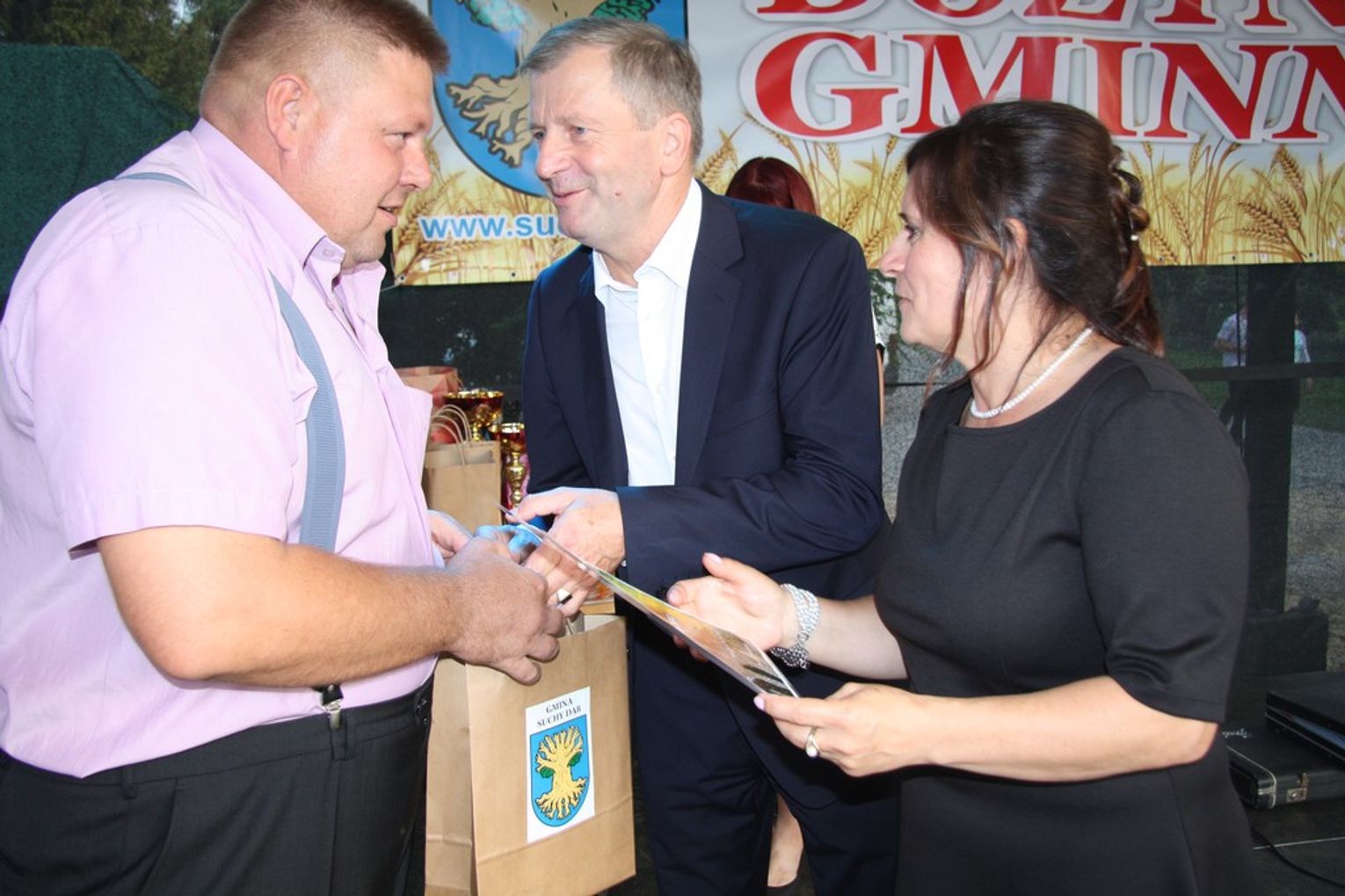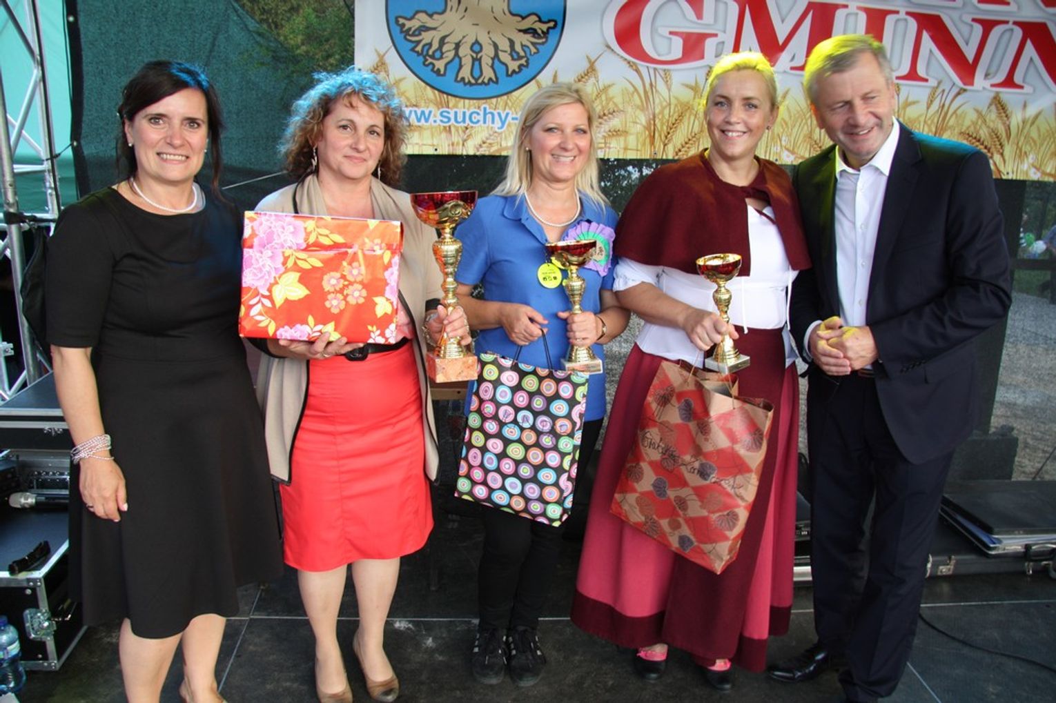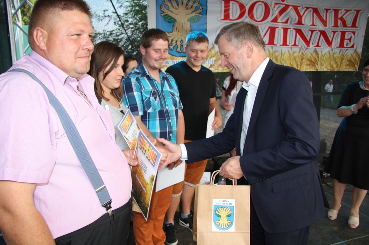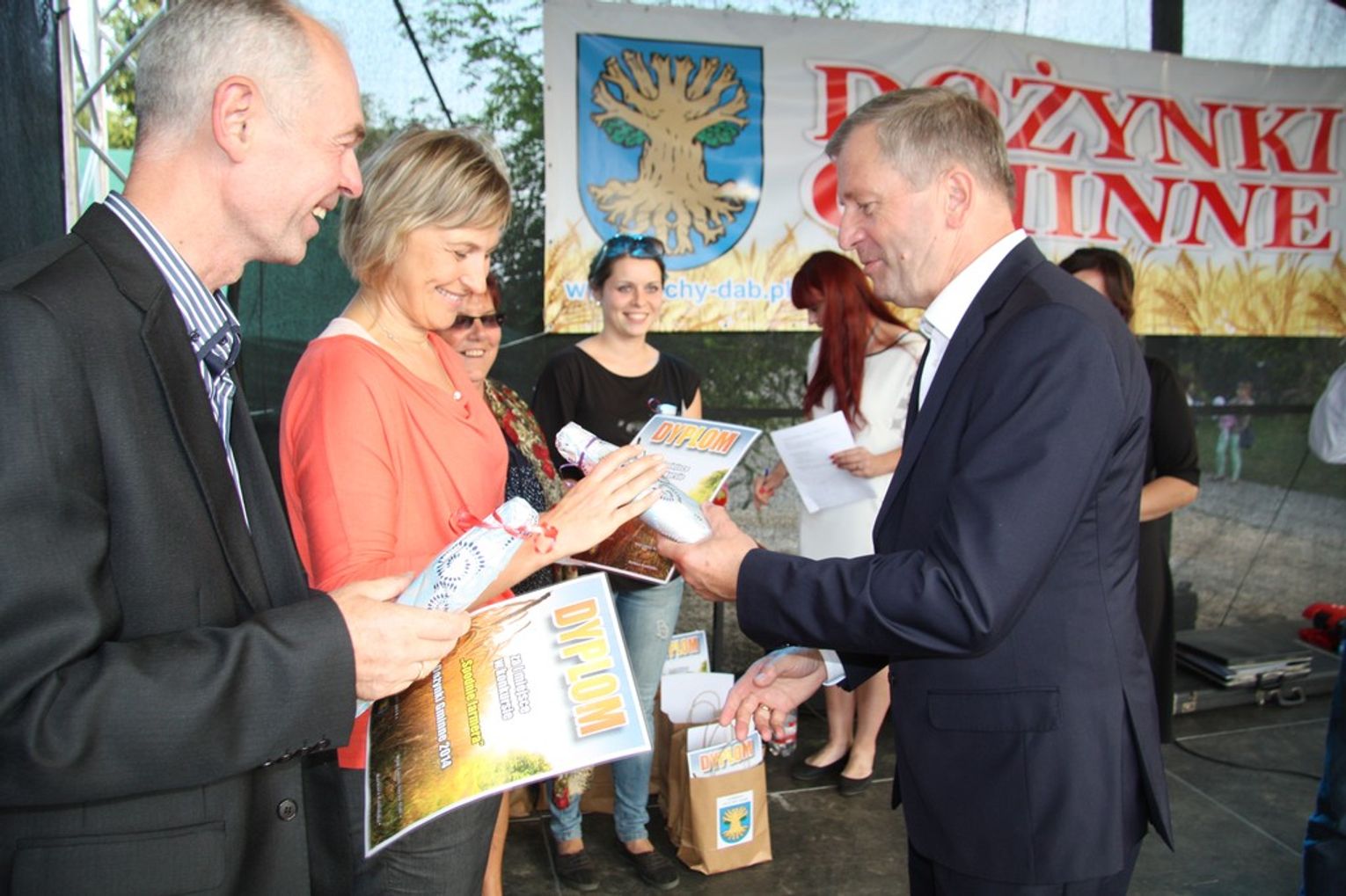 Tegoroczne obchody Dożynek Gminnych odbyły się 13 września w Koźlinach. Ceremoniał dożynkowy rozpoczęła uroczysta Msza Święta w kościele p.w. Matki Boskiej Różańcowej, prowadzona przez ks. Proboszcza Krzysztofa Zdrojewskiego, z udziałem ks. Dziekana Jana Świstowicza oraz ks. Janusza Mathea.Następnie przy asyście Kociewsko – Kaszubskiej Orkiestry Dętej TORPEDA przeszedł z kościoła na miejsce obchodów orszak z wieńcami dożynkowymi wykonanymi przez każde sołectwo naszej Gminy. Nagrodę Marszałka Senatu Bogdana Borusewicza, wręczoną przez p. Małgorzatę Gładysz otrzymał wieniec sołectwa Steblewo.Tegorocznej uroczystości przewodzili Starostowie – sołtys wsi Koźliny p. Antoni Ciunowicz oraz p. Eugenia Fryga.Gości oraz przybyłych mieszkańców powitała p. Wójt Barbara Kamińska. Część artystyczną rozpoczęły Panie z Koła Gospodyń Wiejskich w Koźlinach tańcem ludowym krakowiak oraz piosenką o ich wsi, spędzanym wolnym czasie oraz o naszej Gminie. Piosenkę o Żuławach i również o Gminie Suchy Dąb zaśpiewały dzieci z Zespołu Szkół – Marcelina i Jasiek.Następnie rozpoczął się Turniej Sołectw o Puchar Wójta Gminy Suchy Dąb. W klasyfikacji indywidualnej pierwsze miejsca w konkurencjach zajęły sołectwa:• Kaczka Dziwaczka (wypiek) – Koźliny• Spodnie Farmera – Krzywe Koło• Na narty ze znajomymi – Ostrowite• Skaczcie do góry jak kangury – Koźliny pokonały Suchy Dąb, Steblewo wygrało z Krzywym Kołem, Grabiny-Zameczek z Wróblewem, a Ostrowite z Osicami• Zimne piwko po pracy – Ostrowite• Łaciata – Ostrowite• Na swoją stronę – OstrowiteTym samym sołectwo Ostrowite zdobyło w ogólnej klasyfikacji 45 punktów i wygrało cały Turniej zajmując na podium I miejsce. II miejsce zajęło sołectwo Suchy Dąb, a III miejsce Grabiny-Zameczek.Po wręczeniu nagród i krótkiej przerwie na scenie znów stanęły Gospodynie z Koźlin. Śpiewając Koźlińską Bałkanicę zagrzewały ludzi do tańca. O godzinie 19.00 rozpoczął się występ gwiazdy wieczoru – Jerzego Kryszaka, a po zmroku na obecnych czekały kolejne atrakcje – Fireshow, czyli pokaz tańca z ogniem grupy Flagrantis, a następnie pokaz laserowy firmy Visual Sensation. Zwieńczeniem całej imprezy była zabawa taneczna.W między czasie mieszkańcy naszej Gminy mogli zajrzeć w różne stoiska handlowe, kupić coś do jedzenia i do picia lub nabyć ciekawe gadżety i zabawki. Namioty sołeckie oferowały swojskie jadło, którym można było się poczęstować. Najmłodsi bawili się na zjeżdżalni, karuzeli, w dmuchanych kulach w basenie z wodą, z animatorem – mimem, który miał dla nich mnóstwo niespodzianek i nagród oraz w namiocie Orange, gdzie prowadzone były warsztaty dla dzieci, a także rozdawano watę cukrową i popcorn.Organizator pragnie z całego serca podziękować przede wszystkim:• mieszkańcom Koźlin i KGW Koźliny za przygotowanie terenu, dekoracje i pomoc w przygotowaniu i uprzątnięciu miejsca imprezy,• Kołom Gospodyń Wiejskich za przyrządzenie poczęstunku dla gości,• OSP Koźliny i OSP Steblewo za to, że cały czas czuwali nad naszym bezpieczeństwem,• Koleżankom i kolegom z pracy za ogromne wsparcie i pomoc w przygotowaniach, jak i w czasie trwania całej imprezy.