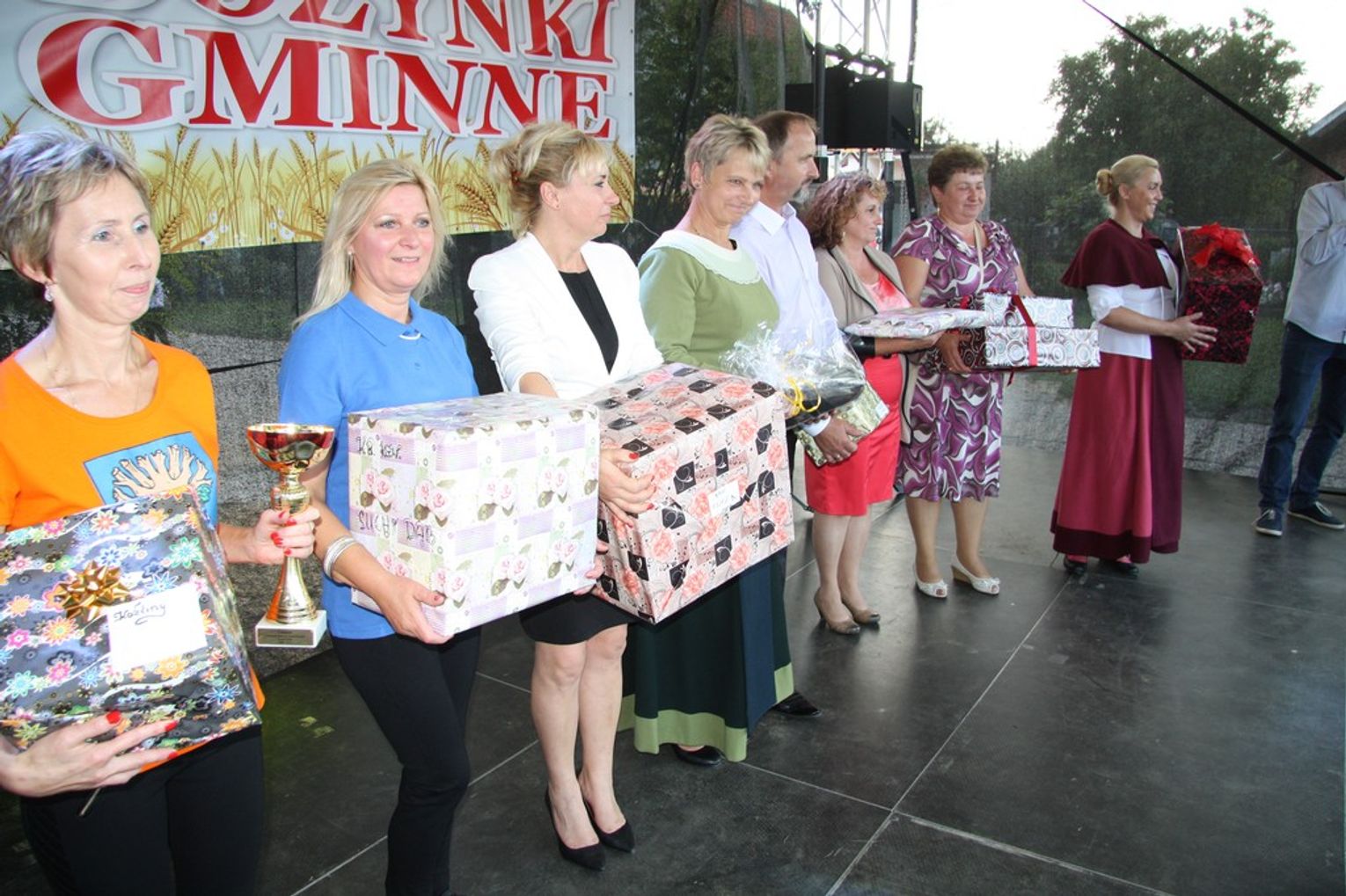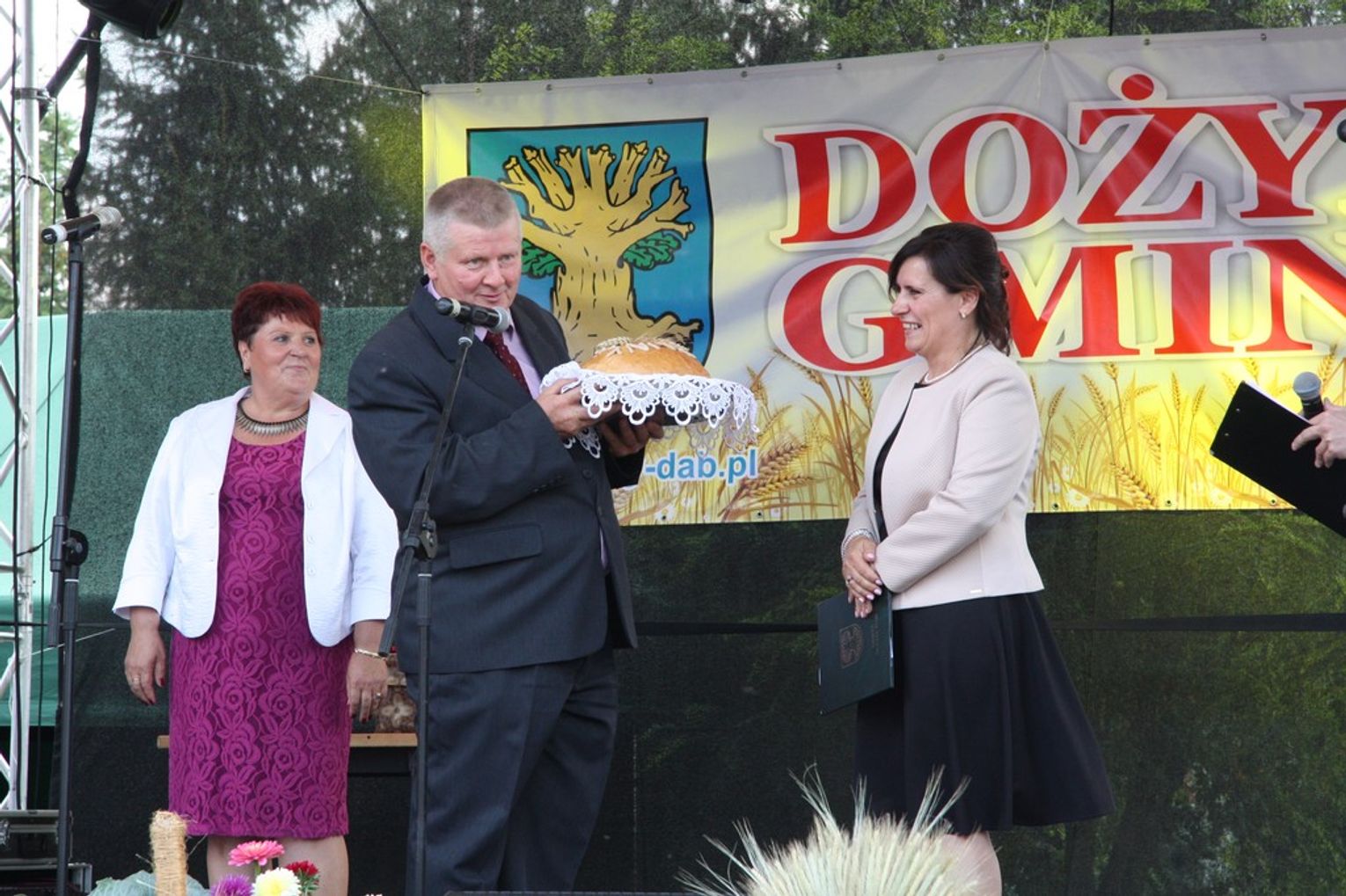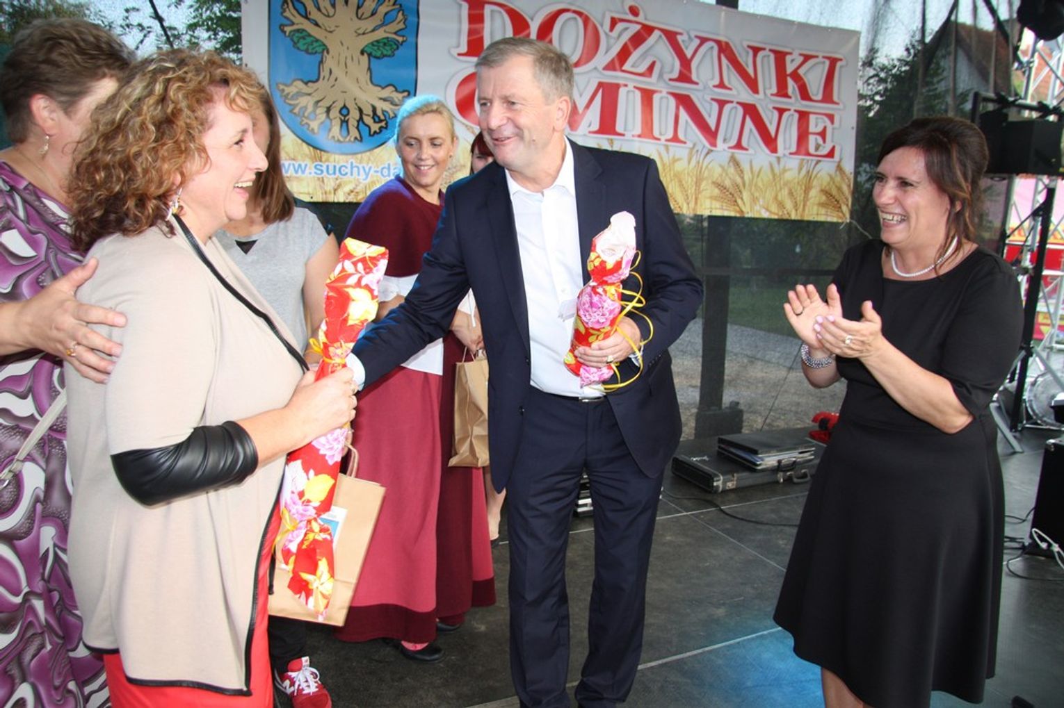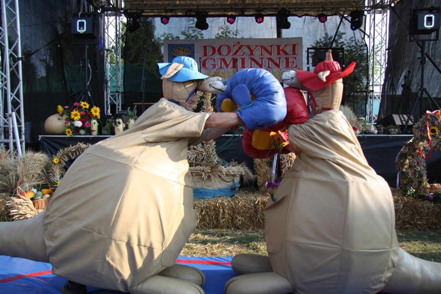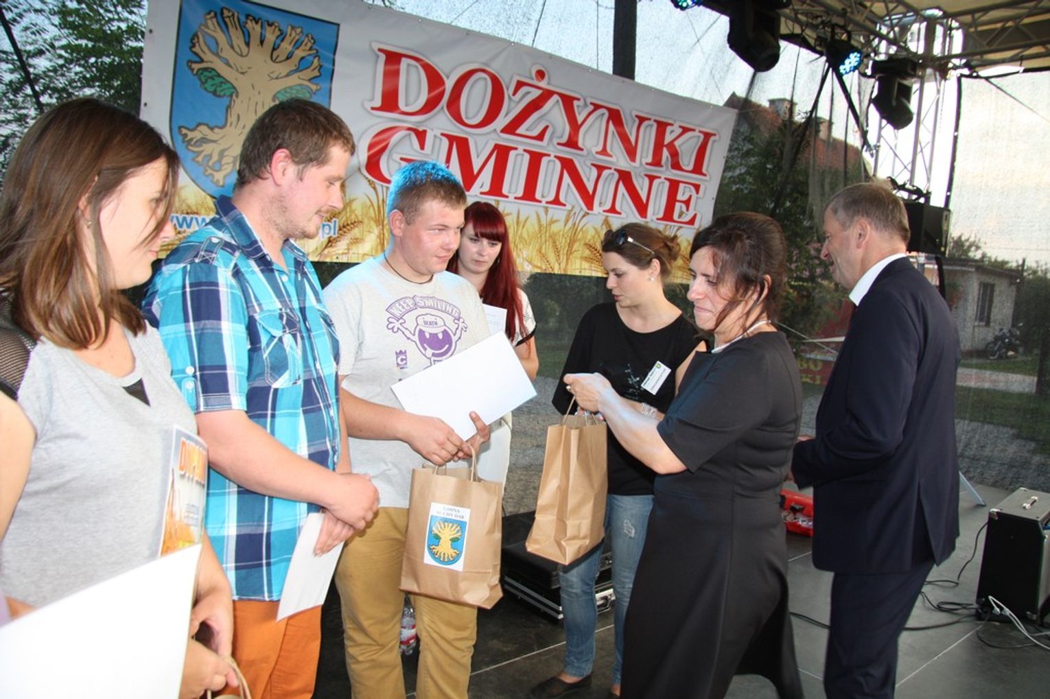 Tegoroczne obchody Dożynek Gminnych odbyły się 13 września w Koźlinach. Ceremoniał dożynkowy rozpoczęła uroczysta Msza Święta w kościele p.w. Matki Boskiej Różańcowej, prowadzona przez ks. Proboszcza Krzysztofa Zdrojewskiego, z udziałem ks. Dziekana Jana Świstowicza oraz ks. Janusza Mathea.Następnie przy asyście Kociewsko – Kaszubskiej Orkiestry Dętej TORPEDA przeszedł z kościoła na miejsce obchodów orszak z wieńcami dożynkowymi wykonanymi przez każde sołectwo naszej Gminy. Nagrodę Marszałka Senatu Bogdana Borusewicza, wręczoną przez p. Małgorzatę Gładysz otrzymał wieniec sołectwa Steblewo.Tegorocznej uroczystości przewodzili Starostowie – sołtys wsi Koźliny p. Antoni Ciunowicz oraz p. Eugenia Fryga.Gości oraz przybyłych mieszkańców powitała p. Wójt Barbara Kamińska. Część artystyczną rozpoczęły Panie z Koła Gospodyń Wiejskich w Koźlinach tańcem ludowym krakowiak oraz piosenką o ich wsi, spędzanym wolnym czasie oraz o naszej Gminie. Piosenkę o Żuławach i również o Gminie Suchy Dąb zaśpiewały dzieci z Zespołu Szkół – Marcelina i Jasiek.Następnie rozpoczął się Turniej Sołectw o Puchar Wójta Gminy Suchy Dąb. W klasyfikacji indywidualnej pierwsze miejsca w konkurencjach zajęły sołectwa:• Kaczka Dziwaczka (wypiek) – Koźliny• Spodnie Farmera – Krzywe Koło• Na narty ze znajomymi – Ostrowite• Skaczcie do góry jak kangury – Koźliny pokonały Suchy Dąb, Steblewo wygrało z Krzywym Kołem, Grabiny-Zameczek z Wróblewem, a Ostrowite z Osicami• Zimne piwko po pracy – Ostrowite• Łaciata – Ostrowite• Na swoją stronę – OstrowiteTym samym sołectwo Ostrowite zdobyło w ogólnej klasyfikacji 45 punktów i wygrało cały Turniej zajmując na podium I miejsce. II miejsce zajęło sołectwo Suchy Dąb, a III miejsce Grabiny-Zameczek.Po wręczeniu nagród i krótkiej przerwie na scenie znów stanęły Gospodynie z Koźlin. Śpiewając Koźlińską Bałkanicę zagrzewały ludzi do tańca. O godzinie 19.00 rozpoczął się występ gwiazdy wieczoru – Jerzego Kryszaka, a po zmroku na obecnych czekały kolejne atrakcje – Fireshow, czyli pokaz tańca z ogniem grupy Flagrantis, a następnie pokaz laserowy firmy Visual Sensation. Zwieńczeniem całej imprezy była zabawa taneczna.W między czasie mieszkańcy naszej Gminy mogli zajrzeć w różne stoiska handlowe, kupić coś do jedzenia i do picia lub nabyć ciekawe gadżety i zabawki. Namioty sołeckie oferowały swojskie jadło, którym można było się poczęstować. Najmłodsi bawili się na zjeżdżalni, karuzeli, w dmuchanych kulach w basenie z wodą, z animatorem – mimem, który miał dla nich mnóstwo niespodzianek i nagród oraz w namiocie Orange, gdzie prowadzone były warsztaty dla dzieci, a także rozdawano watę cukrową i popcorn.Organizator pragnie z całego serca podziękować przede wszystkim:• mieszkańcom Koźlin i KGW Koźliny za przygotowanie terenu, dekoracje i pomoc w przygotowaniu i uprzątnięciu miejsca imprezy,• Kołom Gospodyń Wiejskich za przyrządzenie poczęstunku dla gości,• OSP Koźliny i OSP Steblewo za to, że cały czas czuwali nad naszym bezpieczeństwem,• Koleżankom i kolegom z pracy za ogromne wsparcie i pomoc w przygotowaniach, jak i w czasie trwania całej imprezy.