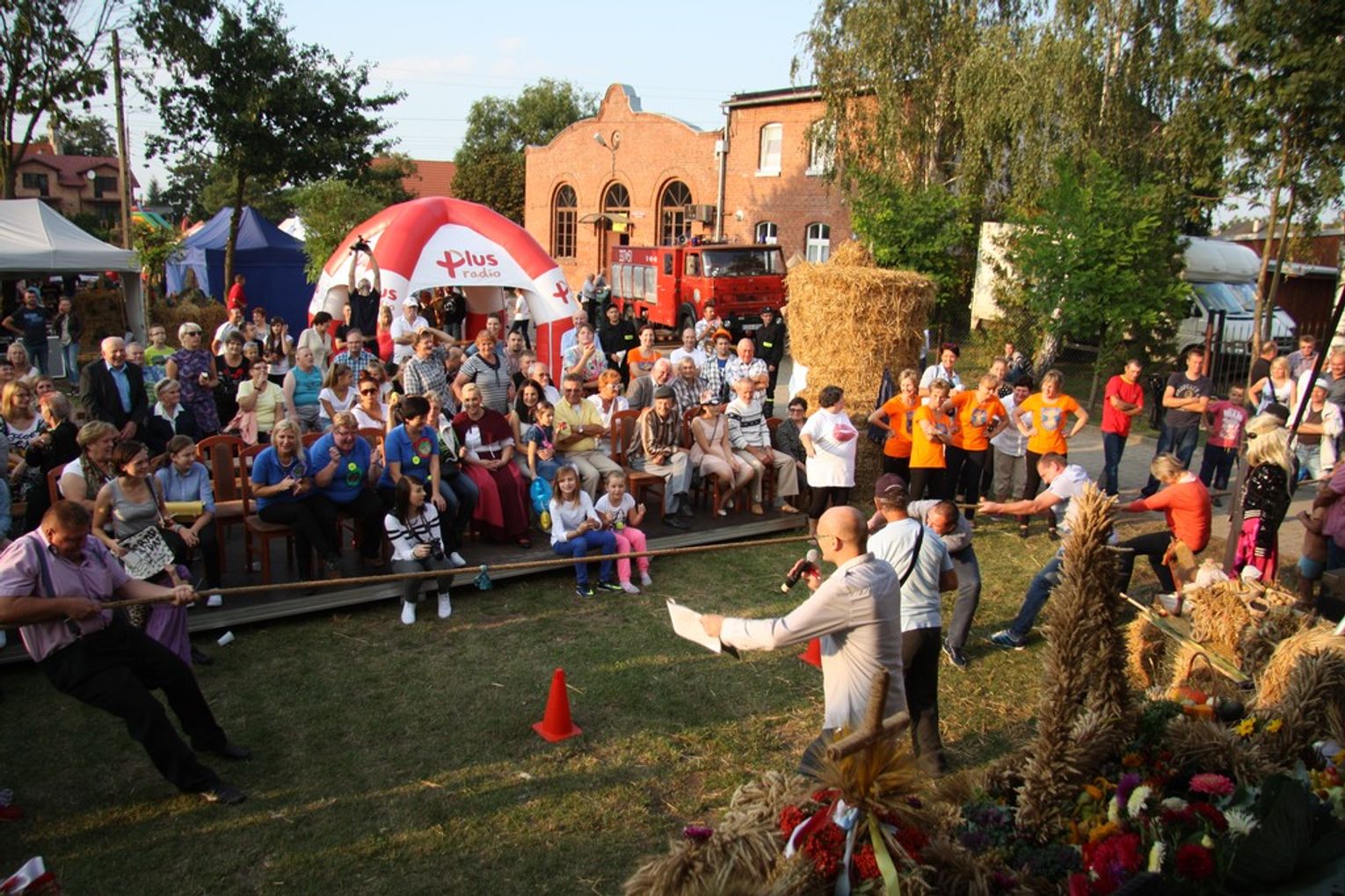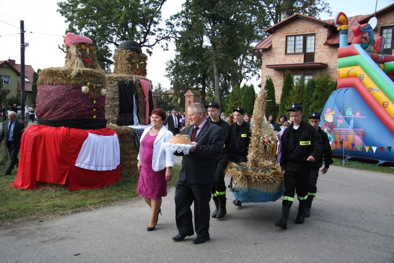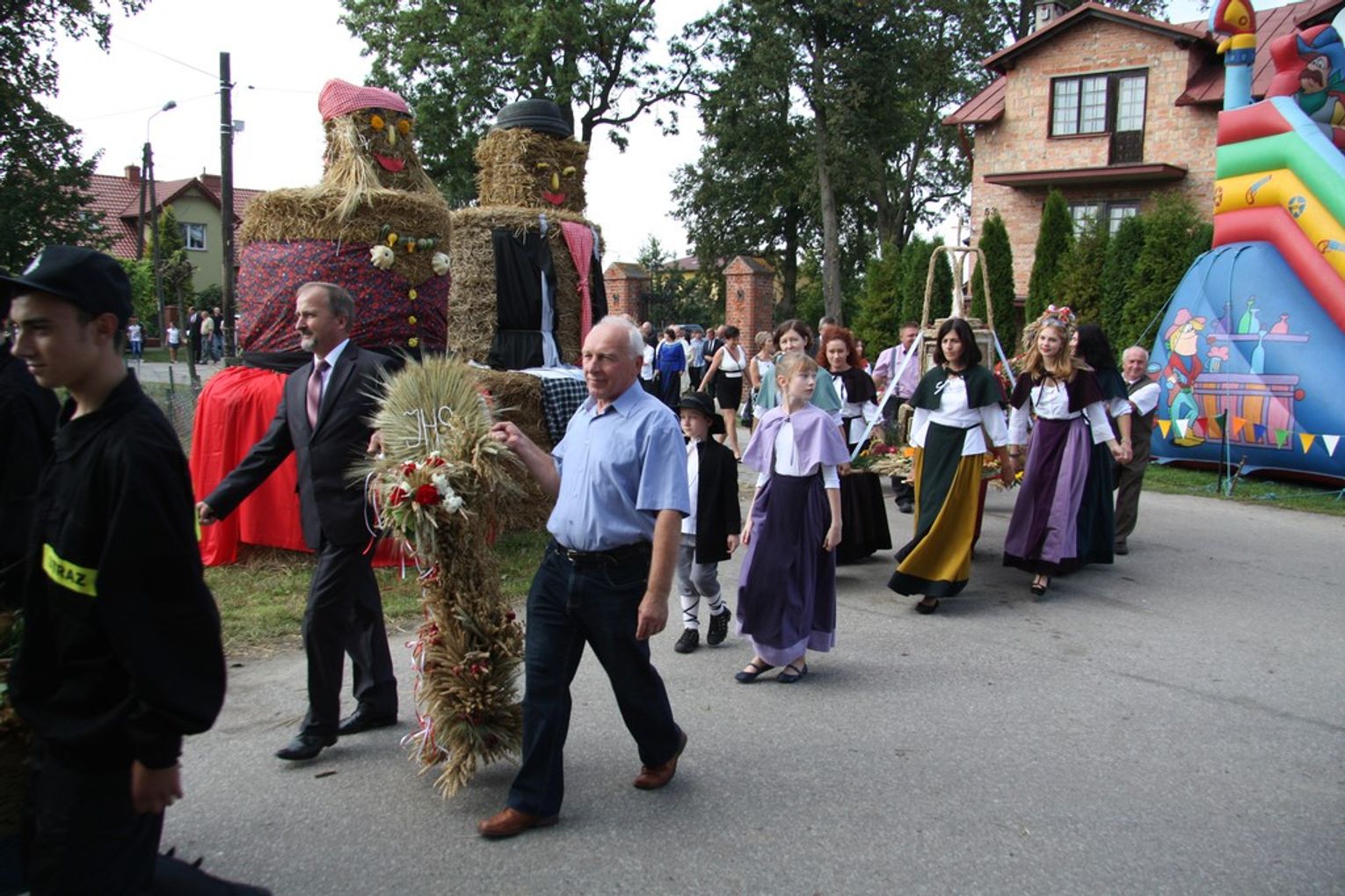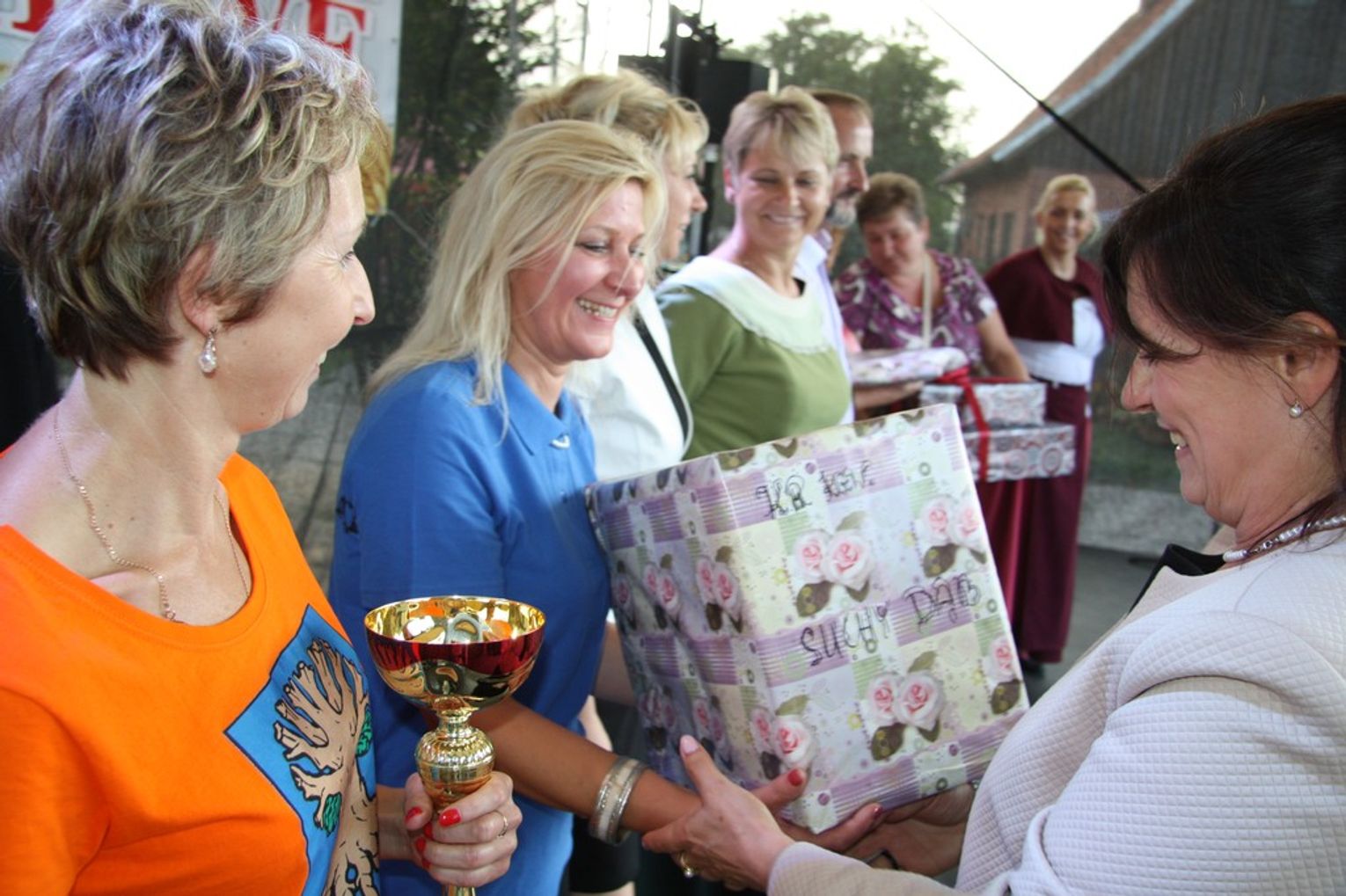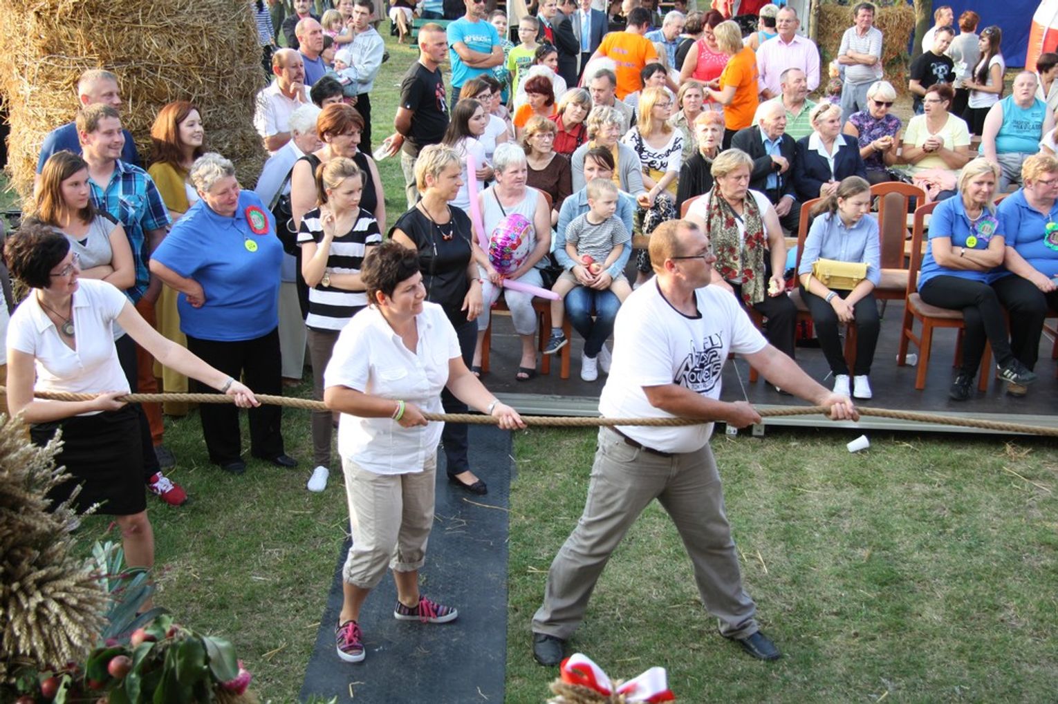 Tegoroczne obchody Dożynek Gminnych odbyły się 13 września w Koźlinach. Ceremoniał dożynkowy rozpoczęła uroczysta Msza Święta w kościele p.w. Matki Boskiej Różańcowej, prowadzona przez ks. Proboszcza Krzysztofa Zdrojewskiego, z udziałem ks. Dziekana Jana Świstowicza oraz ks. Janusza Mathea.Następnie przy asyście Kociewsko – Kaszubskiej Orkiestry Dętej TORPEDA przeszedł z kościoła na miejsce obchodów orszak z wieńcami dożynkowymi wykonanymi przez każde sołectwo naszej Gminy. Nagrodę Marszałka Senatu Bogdana Borusewicza, wręczoną przez p. Małgorzatę Gładysz otrzymał wieniec sołectwa Steblewo.Tegorocznej uroczystości przewodzili Starostowie – sołtys wsi Koźliny p. Antoni Ciunowicz oraz p. Eugenia Fryga.Gości oraz przybyłych mieszkańców powitała p. Wójt Barbara Kamińska. Część artystyczną rozpoczęły Panie z Koła Gospodyń Wiejskich w Koźlinach tańcem ludowym krakowiak oraz piosenką o ich wsi, spędzanym wolnym czasie oraz o naszej Gminie. Piosenkę o Żuławach i również o Gminie Suchy Dąb zaśpiewały dzieci z Zespołu Szkół – Marcelina i Jasiek.Następnie rozpoczął się Turniej Sołectw o Puchar Wójta Gminy Suchy Dąb. W klasyfikacji indywidualnej pierwsze miejsca w konkurencjach zajęły sołectwa:• Kaczka Dziwaczka (wypiek) – Koźliny• Spodnie Farmera – Krzywe Koło• Na narty ze znajomymi – Ostrowite• Skaczcie do góry jak kangury – Koźliny pokonały Suchy Dąb, Steblewo wygrało z Krzywym Kołem, Grabiny-Zameczek z Wróblewem, a Ostrowite z Osicami• Zimne piwko po pracy – Ostrowite• Łaciata – Ostrowite• Na swoją stronę – OstrowiteTym samym sołectwo Ostrowite zdobyło w ogólnej klasyfikacji 45 punktów i wygrało cały Turniej zajmując na podium I miejsce. II miejsce zajęło sołectwo Suchy Dąb, a III miejsce Grabiny-Zameczek.Po wręczeniu nagród i krótkiej przerwie na scenie znów stanęły Gospodynie z Koźlin. Śpiewając Koźlińską Bałkanicę zagrzewały ludzi do tańca. O godzinie 19.00 rozpoczął się występ gwiazdy wieczoru – Jerzego Kryszaka, a po zmroku na obecnych czekały kolejne atrakcje – Fireshow, czyli pokaz tańca z ogniem grupy Flagrantis, a następnie pokaz laserowy firmy Visual Sensation. Zwieńczeniem całej imprezy była zabawa taneczna.W między czasie mieszkańcy naszej Gminy mogli zajrzeć w różne stoiska handlowe, kupić coś do jedzenia i do picia lub nabyć ciekawe gadżety i zabawki. Namioty sołeckie oferowały swojskie jadło, którym można było się poczęstować. Najmłodsi bawili się na zjeżdżalni, karuzeli, w dmuchanych kulach w basenie z wodą, z animatorem – mimem, który miał dla nich mnóstwo niespodzianek i nagród oraz w namiocie Orange, gdzie prowadzone były warsztaty dla dzieci, a także rozdawano watę cukrową i popcorn.Organizator pragnie z całego serca podziękować przede wszystkim:• mieszkańcom Koźlin i KGW Koźliny za przygotowanie terenu, dekoracje i pomoc w przygotowaniu i uprzątnięciu miejsca imprezy,• Kołom Gospodyń Wiejskich za przyrządzenie poczęstunku dla gości,• OSP Koźliny i OSP Steblewo za to, że cały czas czuwali nad naszym bezpieczeństwem,• Koleżankom i kolegom z pracy za ogromne wsparcie i pomoc w przygotowaniach, jak i w czasie trwania całej imprezy.