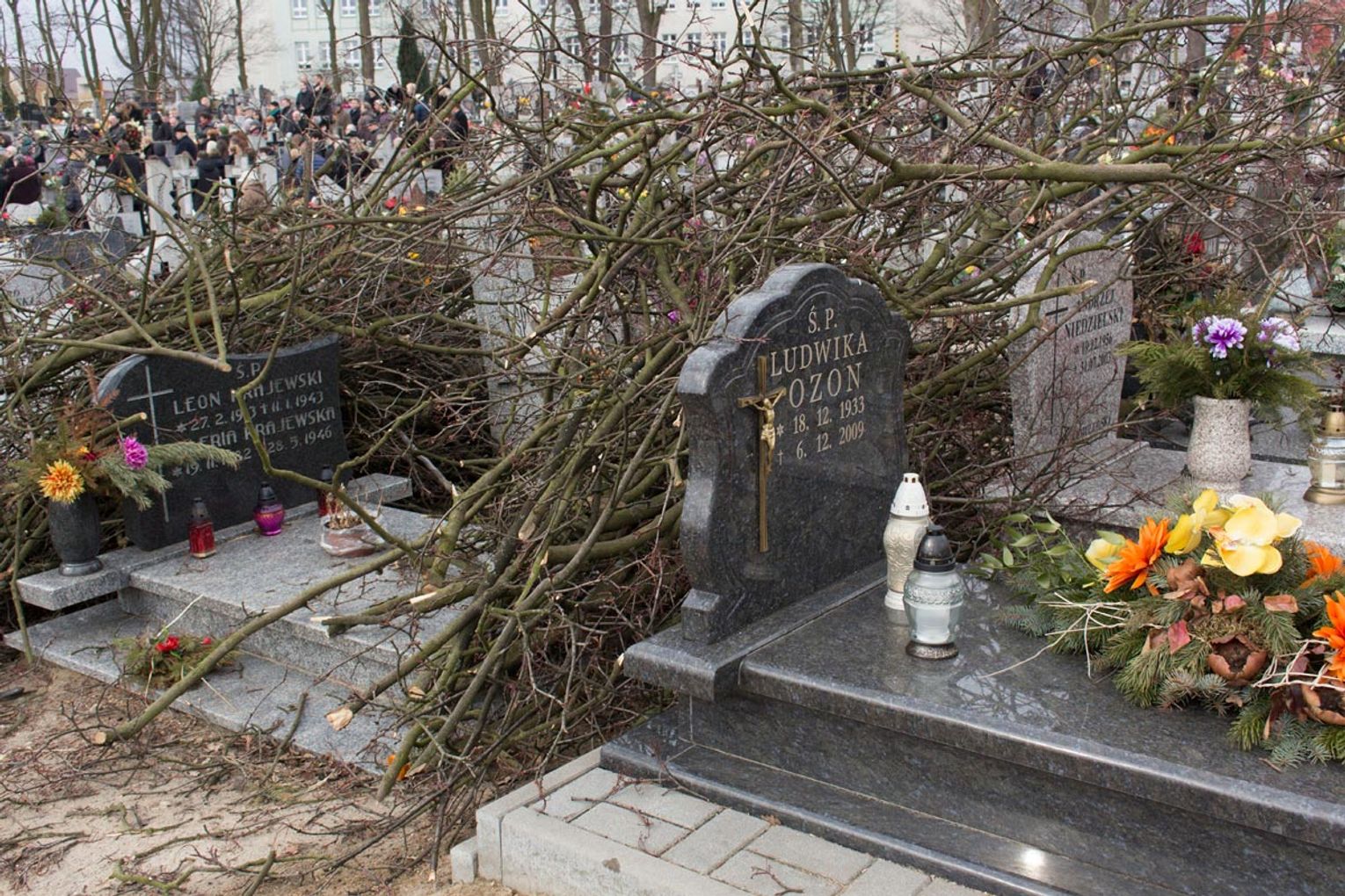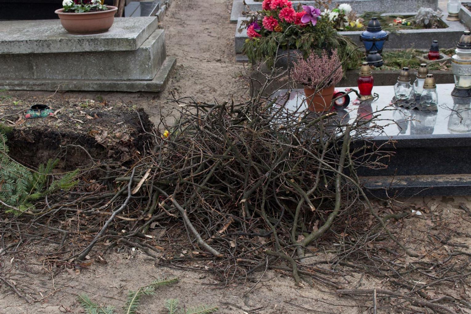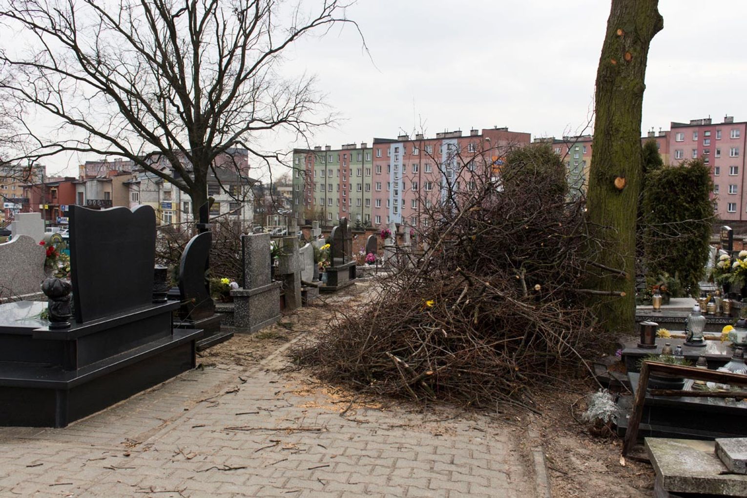 Obcięte gałęzie na cmentarzu przy ul. II Pułku Szwoleżerów Rokitniańskich