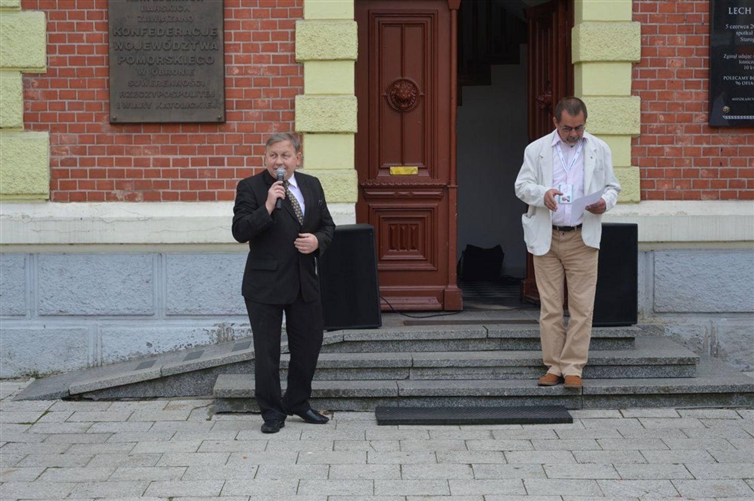 Przed starogardzkim ratuszem odbył się wiec poparcia Prezydenta RP Andrzeja Dudy. Starogardzianie licznie przybyli aby pokazać, że wspierają Dudę. Gościem specjalnym był Leszek Żebrowski, który został powitany wielkimi brawami. Koniec wiecu podsumowany został odśpiewaniem Hymnu Narodowego.Po tym wydarzeniu, w Miejskiej Bibliotece Publicznej im. ks. Bernarda Sychty odbyło się spotkanie autorskie z Leszkiem Żebrowskim, którego organizatorami były Przymierze Narodowe, Konfederacja Narodowa oraz MBP.