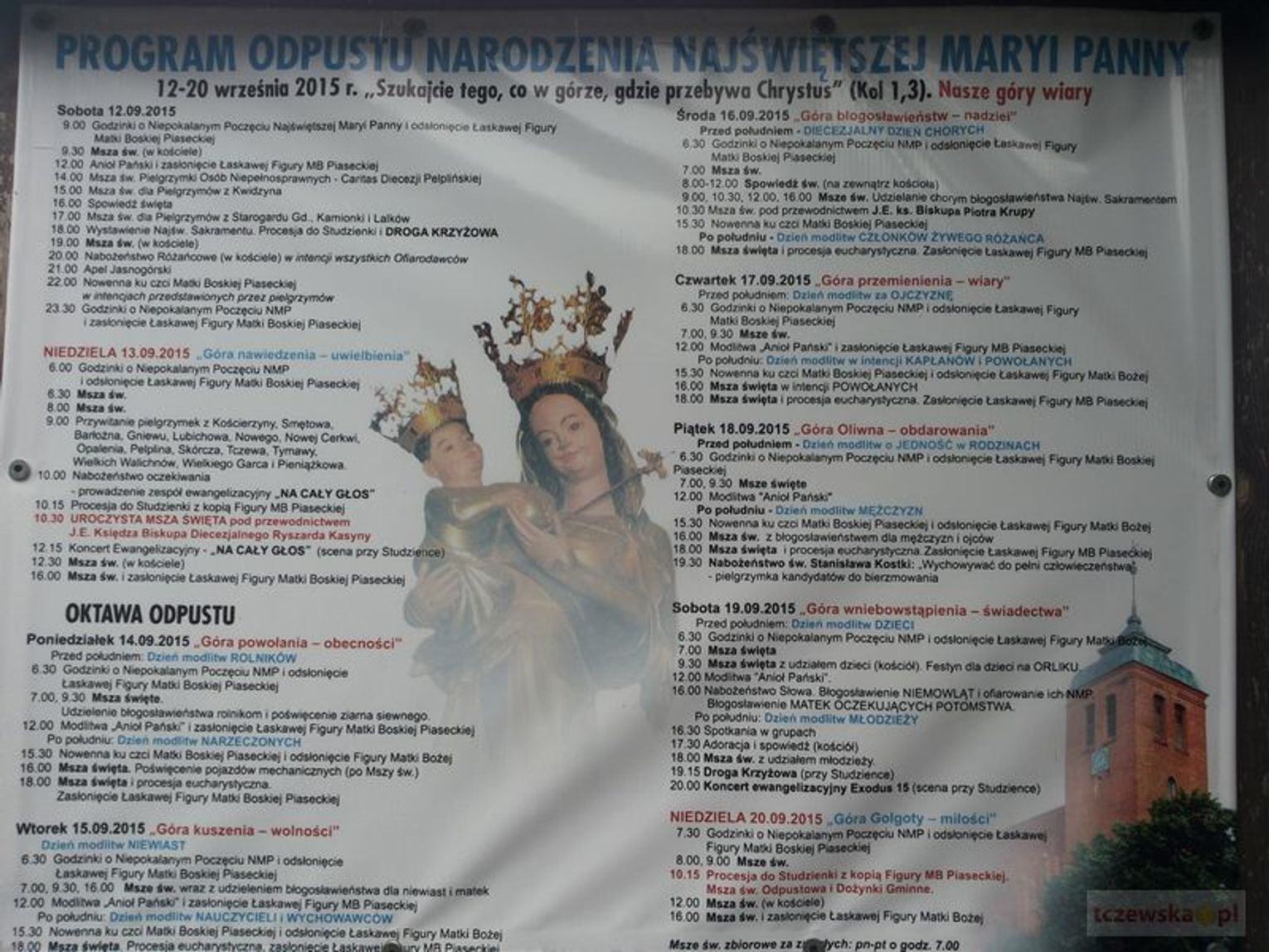 W niedzielę, 20 września zakończyły się uroczystości odpustowe Narodzenia Najświętszej Maryji Panny w Piasecznie. W najstarszym sanktuarium na Pomorzu, Matki Boskiej Piaseckiej Królowej Pomorza, odbyły się dożynki gminy Gniew, które były podziękowaniem za tegoroczne plony rolników. W uroczystościach wzięli udział parlamentarzyści: posłowie Kazimierz Smoliński (PiS) i Jan Kulas (PO), przedstawiciele władz powiatowych - wicestarosta Witold Sosnowski, gminy Gniew - wiceburmistrz Wojciech Szulc, duchowieństwo i kilka tysięcy wiernych. Jak co roku odpustowi towarzyszyły liczne kramiki z słodkościami i różnymi wyrobami.