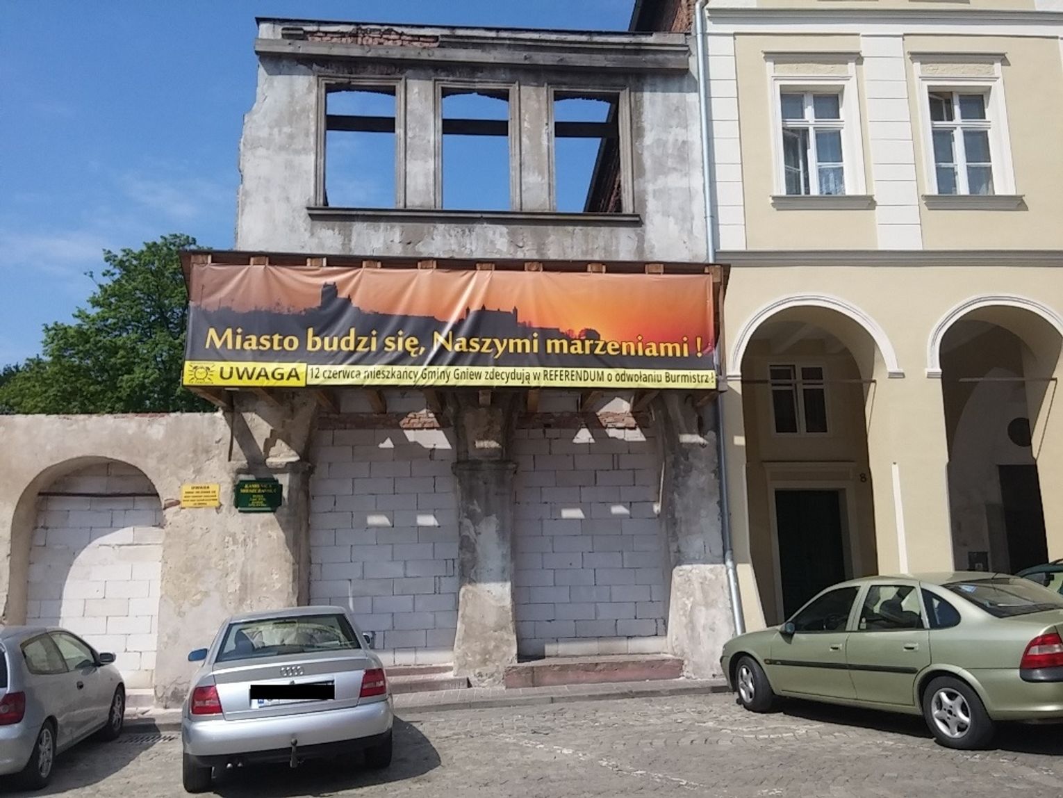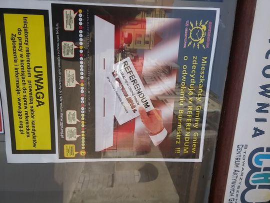 Kampania referendalna w Gniewie ruszyła pełną parą. W poniedziałek słupy ogłoszeniowe i witryny zalepiły plakaty zachęcające do udziału w głosowaniu. 12 czerwca przy urnach mieszkańcy gminy odpowiedzą na następujące pytanie: „Czy jest Pan/Pani za odwołaniem Marii Barbary Taraszkiewicz – Gurzyńskiej Burmistrza Miasta i Gminy Gniew przed upływem kadencji?” Głosowanie potrwa od godz. 7 do godz. 21. Aby było ważne muszą wziąć w nim udział 3/5 wyborców, którzy poszli do urn 30 listopada 2015 r. podczas II tury wyborów samorządowych, czyli ok. 2400 osób. Władze gminy szacują koszty referendum na ok. 30 tys. zł, choć dokładne wyliczenia nie są póki co znane.