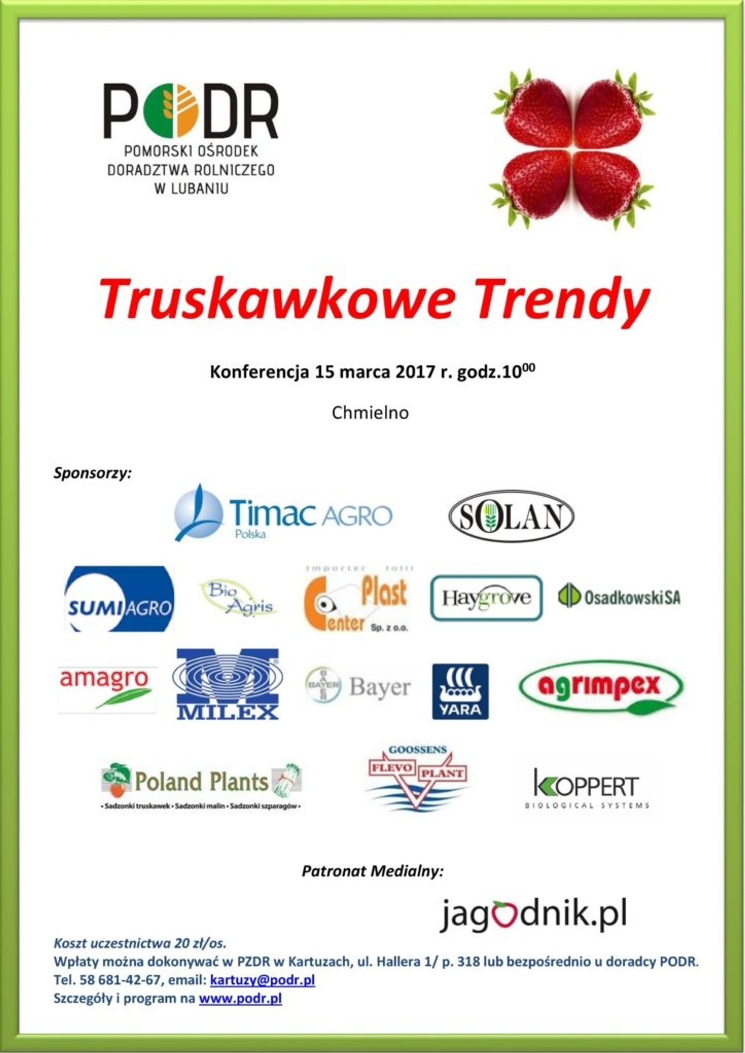 Pomorski Ośrodek Doradztwa Rolniczego w Lubaniu zaprasza na konferencję pt. Truskawkowe Trendy, która odbędzie się jutro, 15 marca, o godz.10.00 w Kaszubskiej Oazie Zdrowia w Chmielnie.