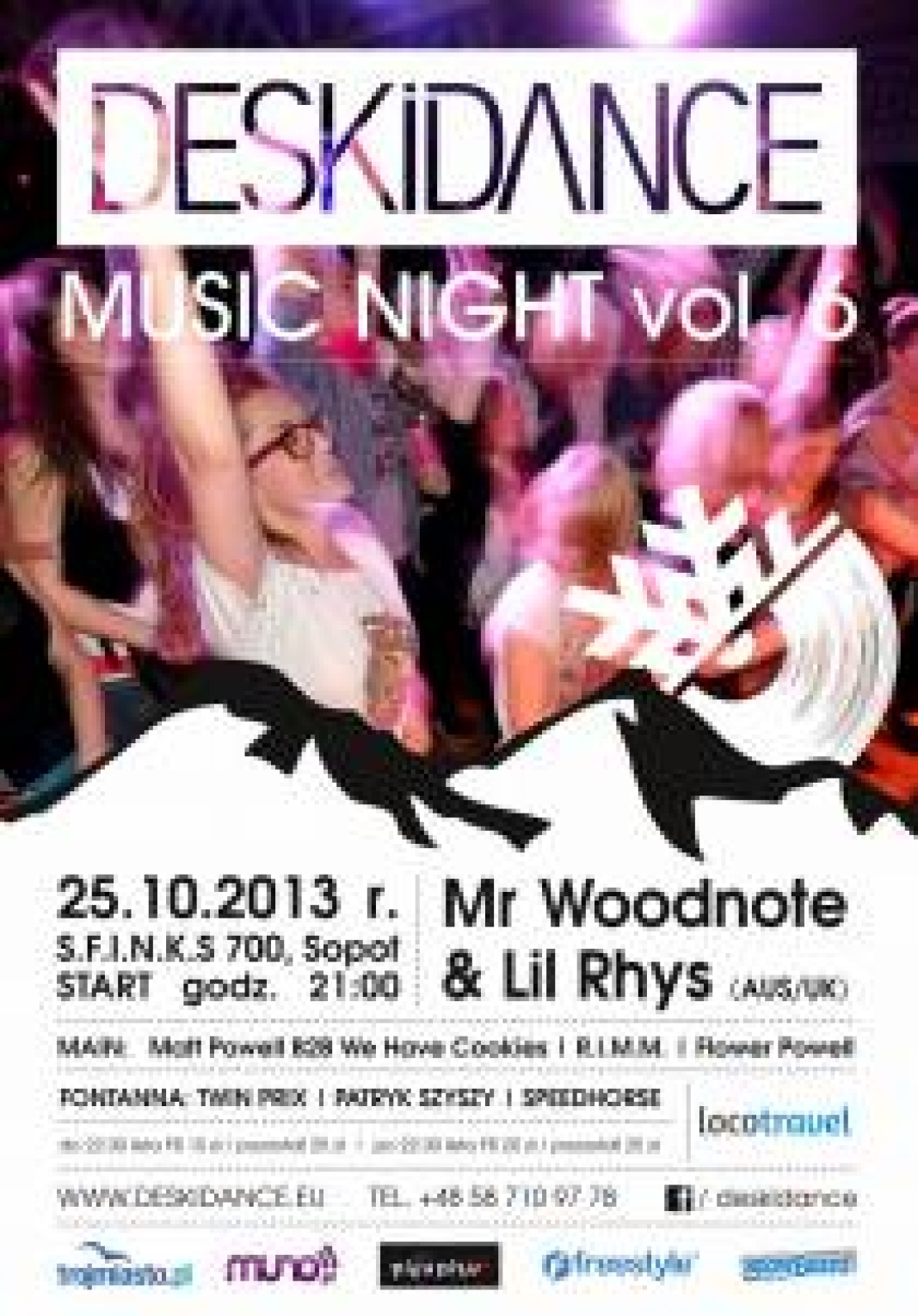 DESKIDANCE Music Night vol. 6, to gorąca noc, z muzyką na żywo i szalonym przytupem otwierająca sezon zimowy! Line-up wieczoru gwarantuje parkiet pełen ludzi, ścisk w szatni i kolejkę do baru! Ale w końcu tak powinna wyglądać impreza by skutecznie przywołać białe zimowe szaleństwo! Na scenie jako gwiazda pojawi się kreatywny i porywający muzyk - Mr Woodnote, znany ze wspólnych występów z jego rodakiem i wirtuozem loop stacji, Dub FX’em. Tego wieczoru w duecie ze swym kompanem Lil Rhys’em przy mikrofonie zahipnotyzują publiczność brzmieniem saksofonu, zaskakującym beatbox’em i skocznym brytyjskim rapem. Bujają publicznością w prawo i w lewo wciągając ją we wspólną zabawę okrzykiem, oklaskiem i różnymi stylami muzycznymi. To będzie niezapomniany wieczór oczywiście z saksofonem w roli głównej.