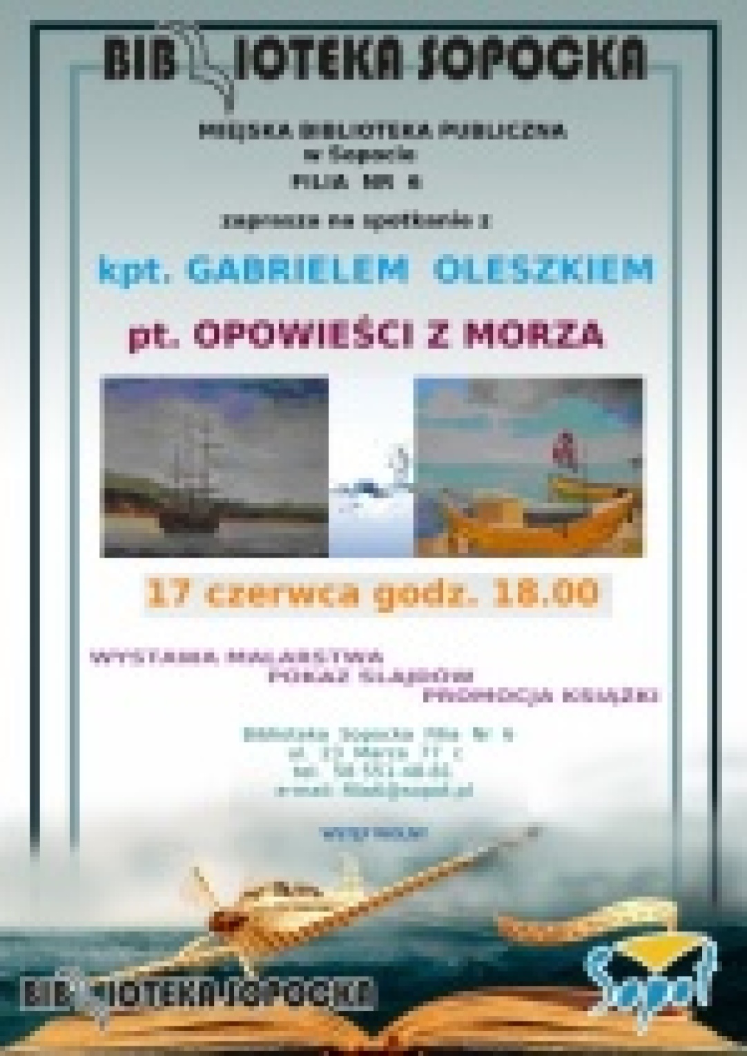 Filia nr 6 Sopockiej Biblioteki serdecznie zaprasza na spotkanie autorskie z kpt. Gabrielem Oleszkiem, połączone z wystawą jego malarstwa i promocją książek. Prelegent po blisko 30. latach pływania na statkach zajął się malowaniem obrazów o tematyce morskiej. Ponadto napisał kilkadziesiąt książek o tematyce marynistycznej, często z wątkiem sensacyjnym. Spotkanie urozmaicone będzie ciekawymi opowieściami i pokazem slajdów z morskich podróży. Zapraszamy we wtorek 17 czerwca, o godz. 18.00. ul. 23 Marca 77 c w Sopocie Wstęp wolny!
