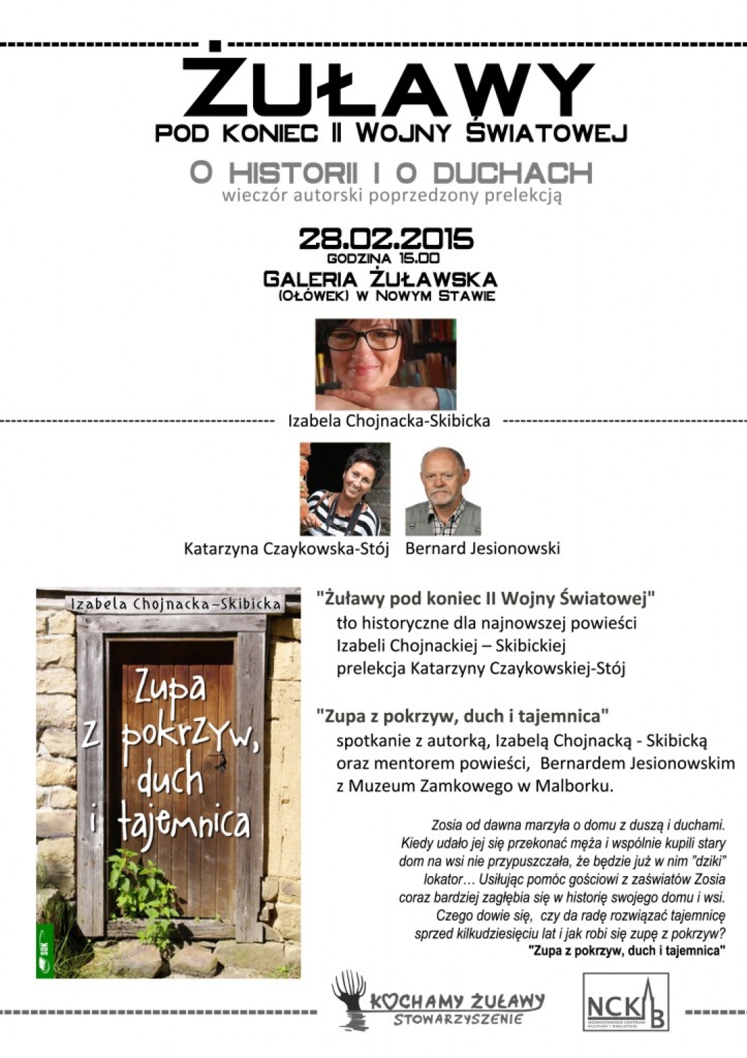 Stowarzyszenie “kochamy Żuławy ,oraz Nowostawskie Centrum Kultury i Biblioteki pragną zaprosić wszystkich bardzo serdecznie na “Żuławy pod koniec II Wojny Światowej- o historii i duchach”. Wydarzenie odbędzie się dnia 28.02.2015 r. o godz. 15:00 w Galerii Żuławskiej.W trakcie wydarzenia będzie miało miejsce spotkanie z autorką oraz prezentacja nowej książki IZABELI CHOJNACKIEJ – SKIBICKIEJ – “ZUPA Z POKRZYW, DUCH I TAJEMNICA”. Wieczór autorki poprzedzi prelekcja KATARZYNY CZAYKOWSKIEJ– STÓJ,przybliżająca czytelnikom tło historyczne powieści.