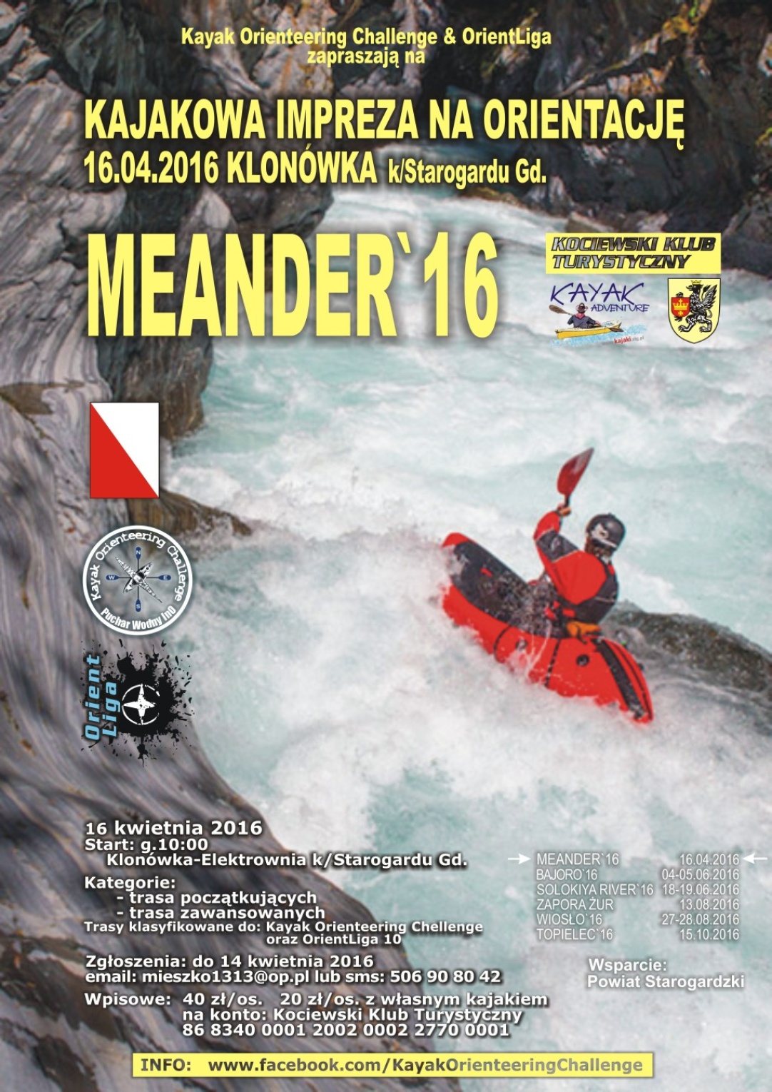 Już w najbliższą sobotę 16 kwietnia 2016 zapraszamy na MEANDER`16. Imprezę rozgrywamy na rzece Wierzycy, rozpoczęcie godz.10:00: Elektrownia - Klonówka.