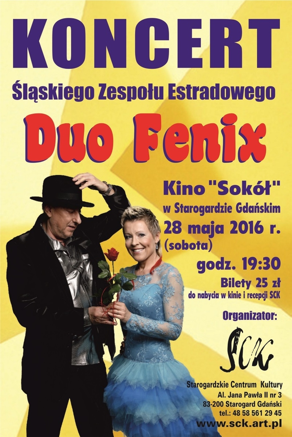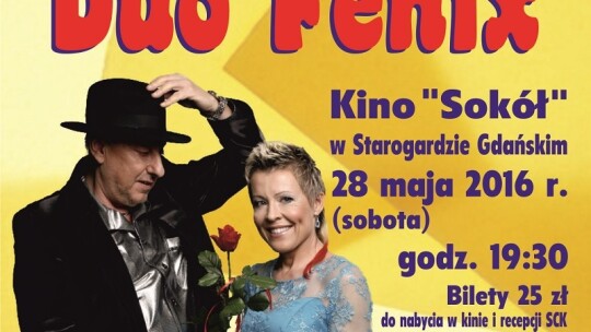 28 maja o godzinie 19:30 w kinie "Sokół" w Starogardzie Gdańskim odbędzie się koncert popularnego zespołu estradowego ze Śląska "Duo Fenix". Zespół w składzie: Krystyna Dubik i Waldemar Kołaczyk istnieje od 1993 roku. Od 2002 roku występują w duecie pod dwoma nazwami "Duo Fenix - Dwa Fyniki", a o od 2013 roku w tercecie z Kacprem. W roku 2011 zespół osiągnął pełnoletność - 18 lat działalności artystycznej. Przez te wszystkie lata grupa wydała 16 płyt, na których znajduje się wiele przebojów zarówno w gwarze śląskiej jak i w języku literackim.