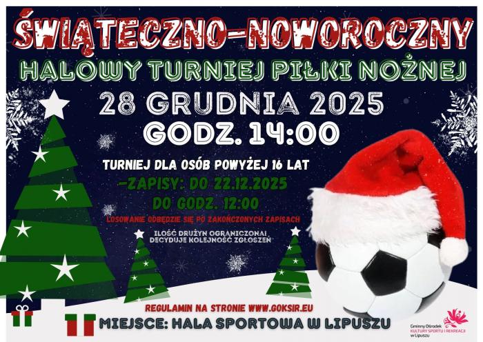 Gminny Ośrodek Kultury, Sportu i Rekreacji w Lipuszu zaprasza miłośników piłki nożnej do udziału w świąteczno-noworocznym turnieju halówki. Wydarzenie odbędzie się w niedzielę, 28 grudnia 2025 roku, w hali sportowej w Lipuszu, a początek rywalizacji zaplanowano na godzinę 14:00.