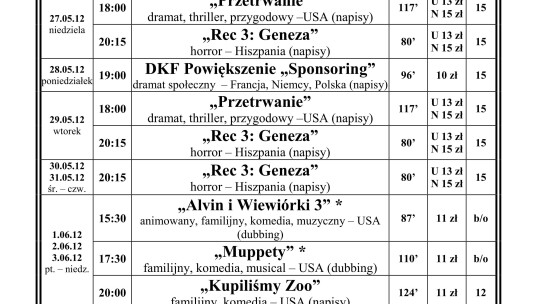 30.05.12 31.05.12 śr. – czw. | 20:15 | „Rec 3: Geneza” horror – Hiszpania (napisy) | 80’ | U 13 zł N 15 zł | 15 |