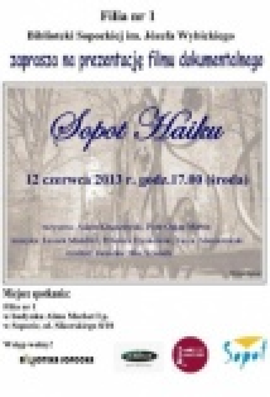 Filia nr 1 Biblioteki Sopockiej serdecznie zaprasza wszystkich zainteresowanych na prezentację filmu dokumentalnego pt: Sopot Haiku Gościem specjalnym spotkania będzie reżyser filmu Piotr Oskar Martin 12 czerwca 2013r. godz. 17.00 (środa) w budynku Alma Market I p. w Sopocie, ul. Sikorskiego 8/10